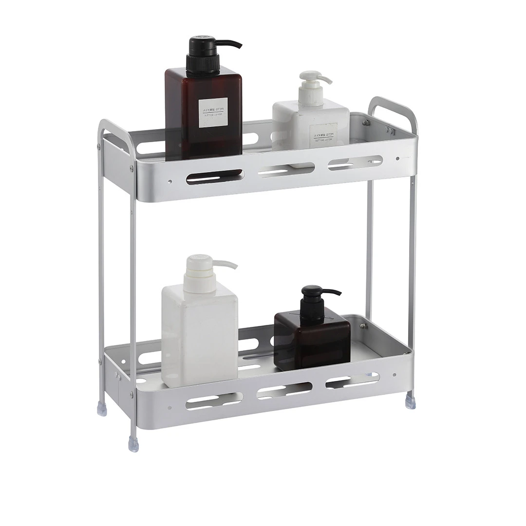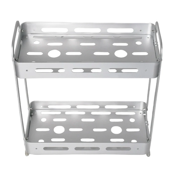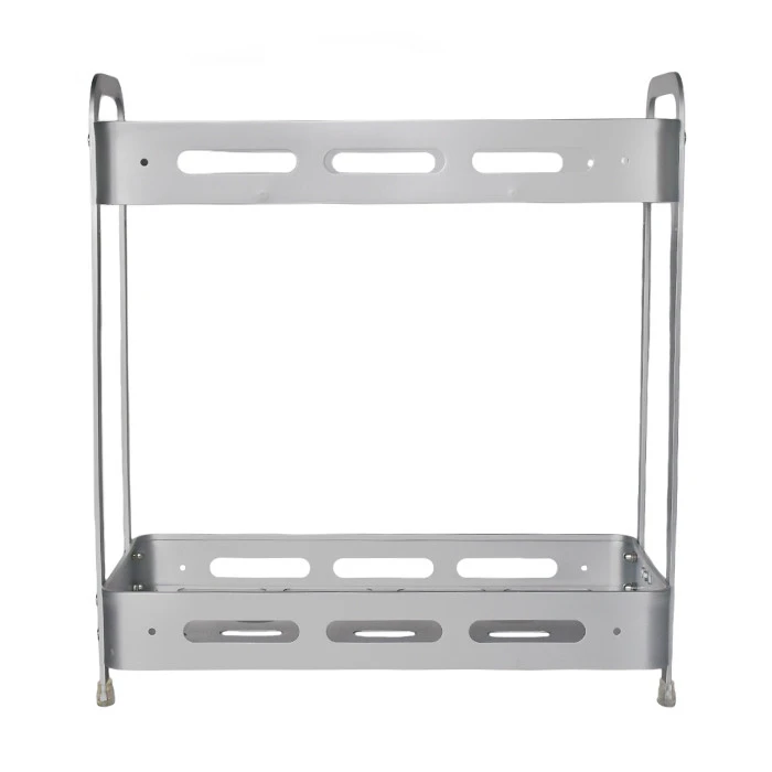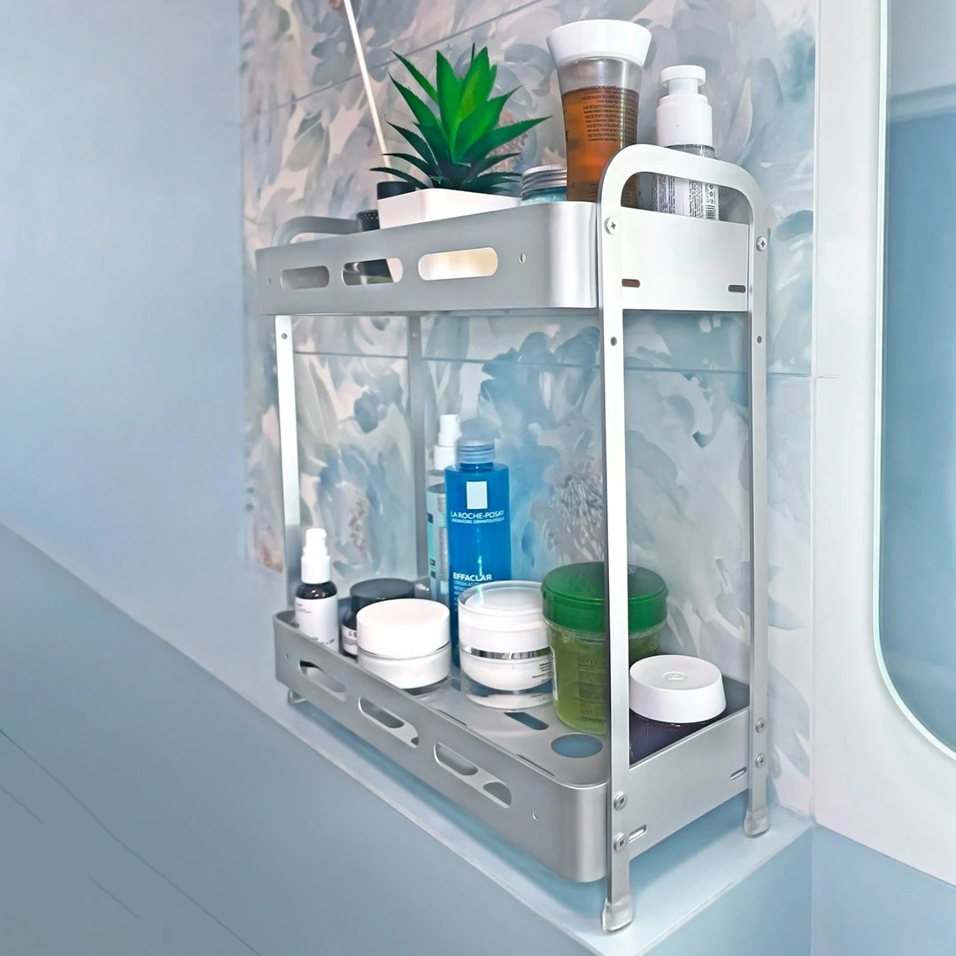 Компактна двоярусна полиця — зручне рішення для зберігання речей у ванній, на кухні чи в передпокої. Вона займає мінімум місця, але дозволяє тримати все необхідне під рукою та в порядку. Алюмінієва конструкція стійка до вологи та не іржавіє, а матове покриття надає сучасного вигляду. Легка та мобільна, вона легко переміщується за потреби.