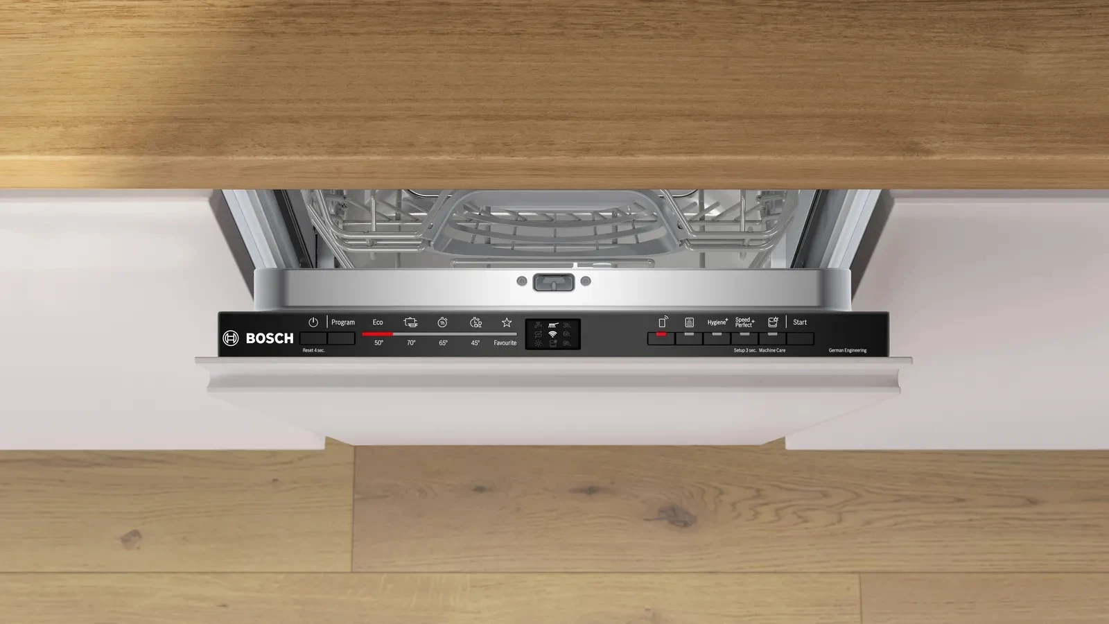 Вбудована посудомийна машина Bosch SPV2HMX03K підтримує Home Connect для дистанційного керування та моніторингу зі смартфона. SpeedPerfect+ скорочує тривалість миття (залежно від програми та моменту активації), а «Тиша на вимогу» тимчасово зменшує шум протягом приблизно 30 хв. Easy Start радить оптимальну програму під тип і ступінь забруднення, а «Улюблене» дозволяє запускати збережені комбінації одним дотиком. RackMatic регулює висоту верхнього короба на трьох рівнях, стопори стабілізують нижній короб.