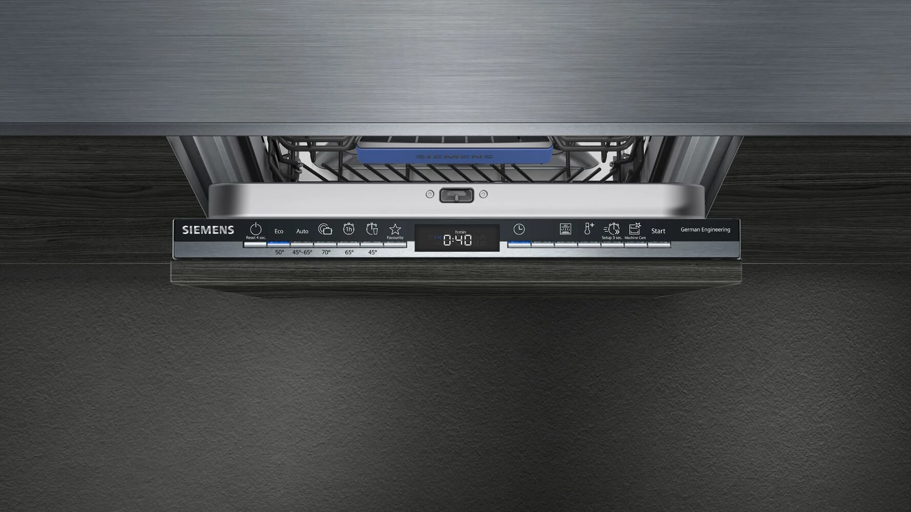Вбудована посудомийна машина Siemens SP63HX65MK шириною 45 см. Система рівномірного розчинення миючого засобу dosageAssist. Два коромисли duoPower у верхньому коробі. Двигун iQdrive. Повністю вбудований прилад.