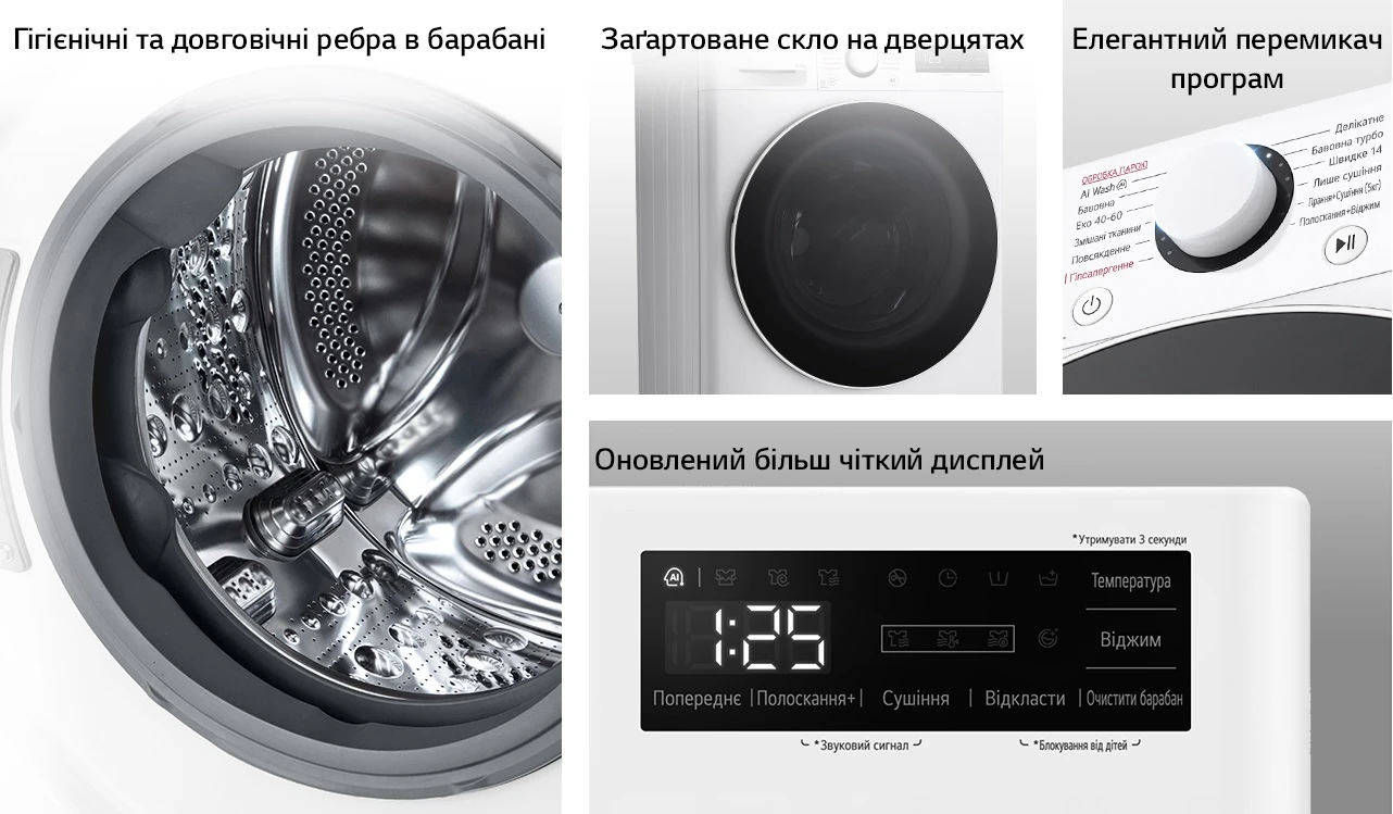 - Особенности Smart Diagnosis; Конденсаційна система сушіння; Технологія визначення властивостей тканини AI DD ™;