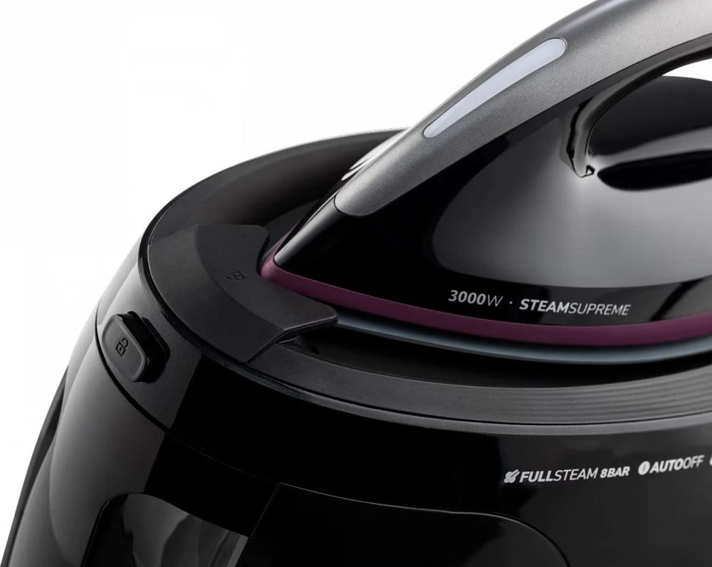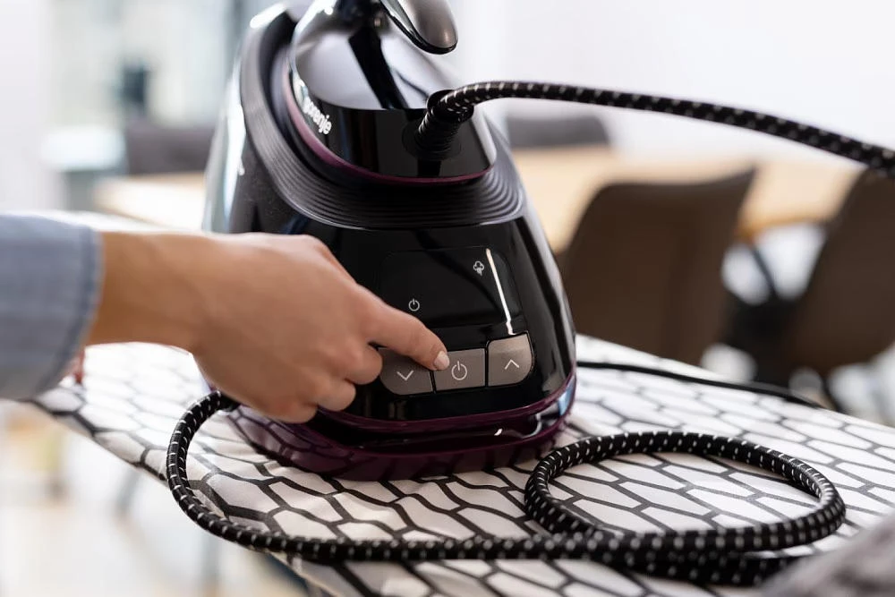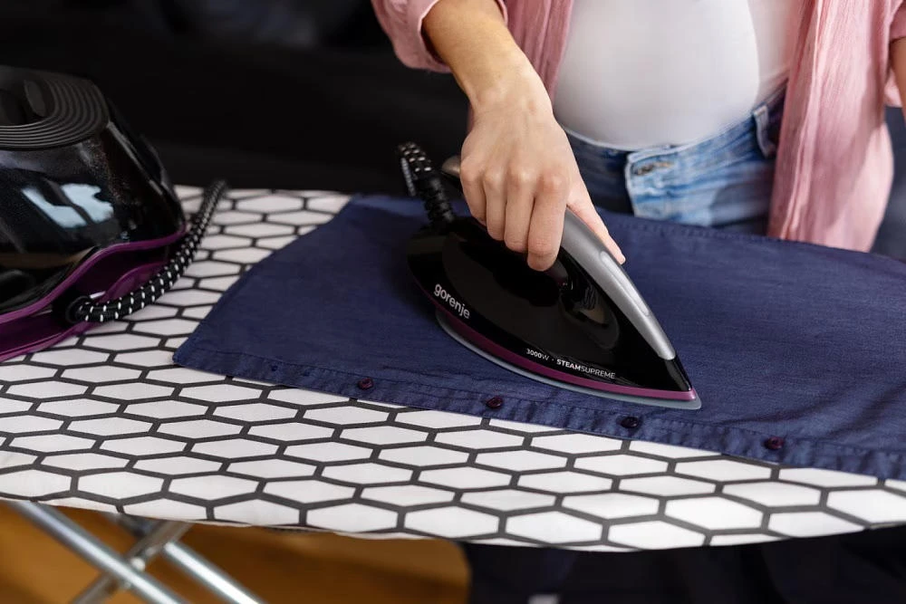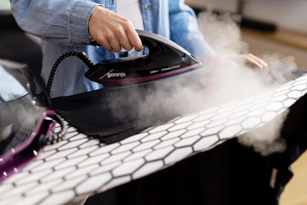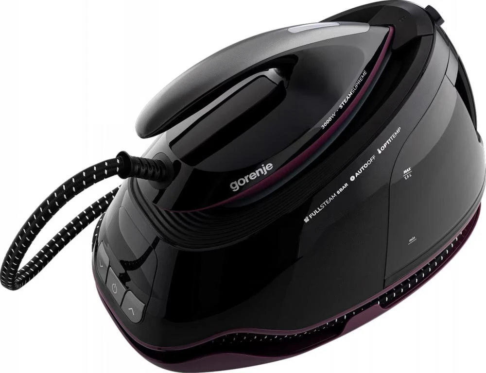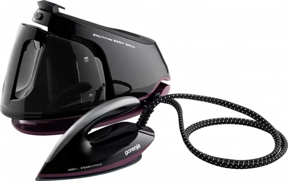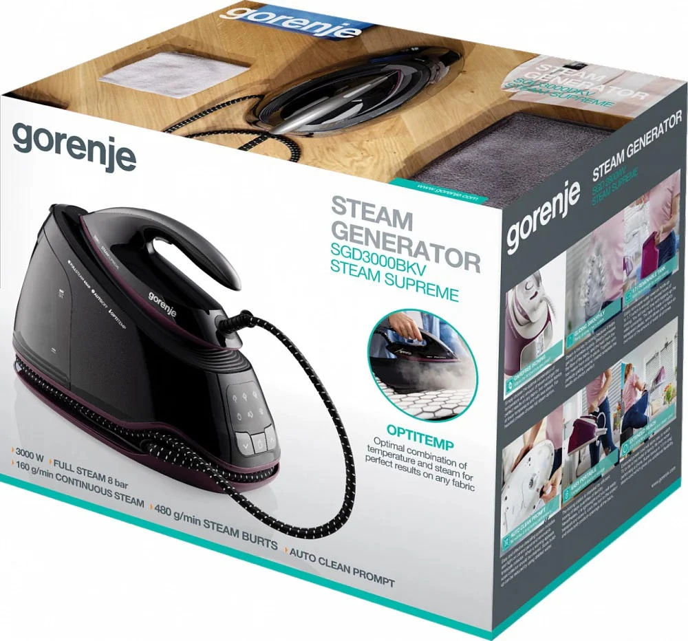 Парогенератор Gorenje потужністю 3000 Вт має знімний резервуар об’ємом 1,5 л, постійну подачу пари 160 г/хв і паровий удар 480 г/хв. Оснащений LED-дисплеєм, цифровим керуванням, системою проти накипу, індикатором зносу картриджа, автоматичним вимкненням та керамічною підошвою. Тиск пари – 8 бар.
