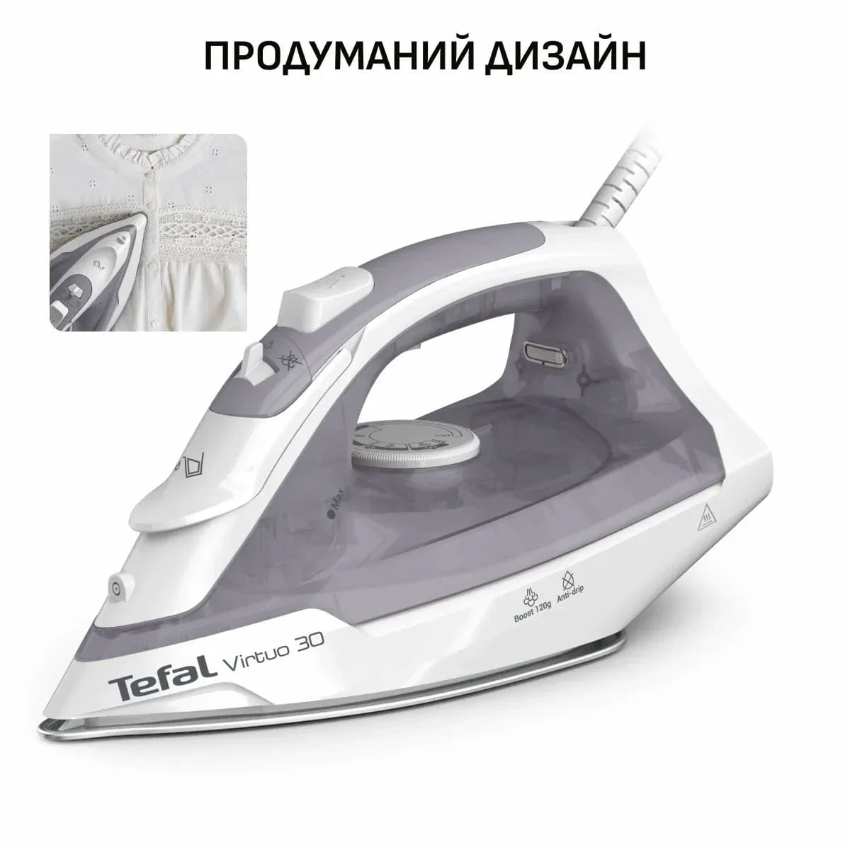Праска Tefal Virtuo 30, 2000Вт, 240мл, паровий удар -120гр, постійна пара - 27гр, керам. підошва, сі