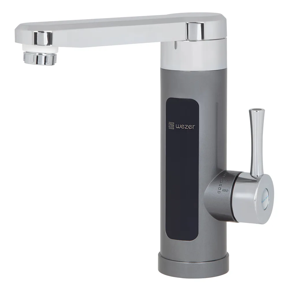 Проточний водонагрівач для умивальника з поворотним виливом. Корпус виготовлено з ABS пластику сірого кольору. Живлення АС 220-240В, 50Гц. Тен потужністю 3.3кВт. Температура нагріву 30 - 65°C. Тиск в системі від 0.5 до 6 бар. Індикація температури за допомогою дисплея. Клас захисту - ІРХ4. Встановлення на умивальник, фіксація прижимною гайкою, гідравлічне з'єднання - зовнішня різьба 1/2". В комплекті кабель 1.2 метри з вилкою європейського зразка. Гарантія 1 рік.