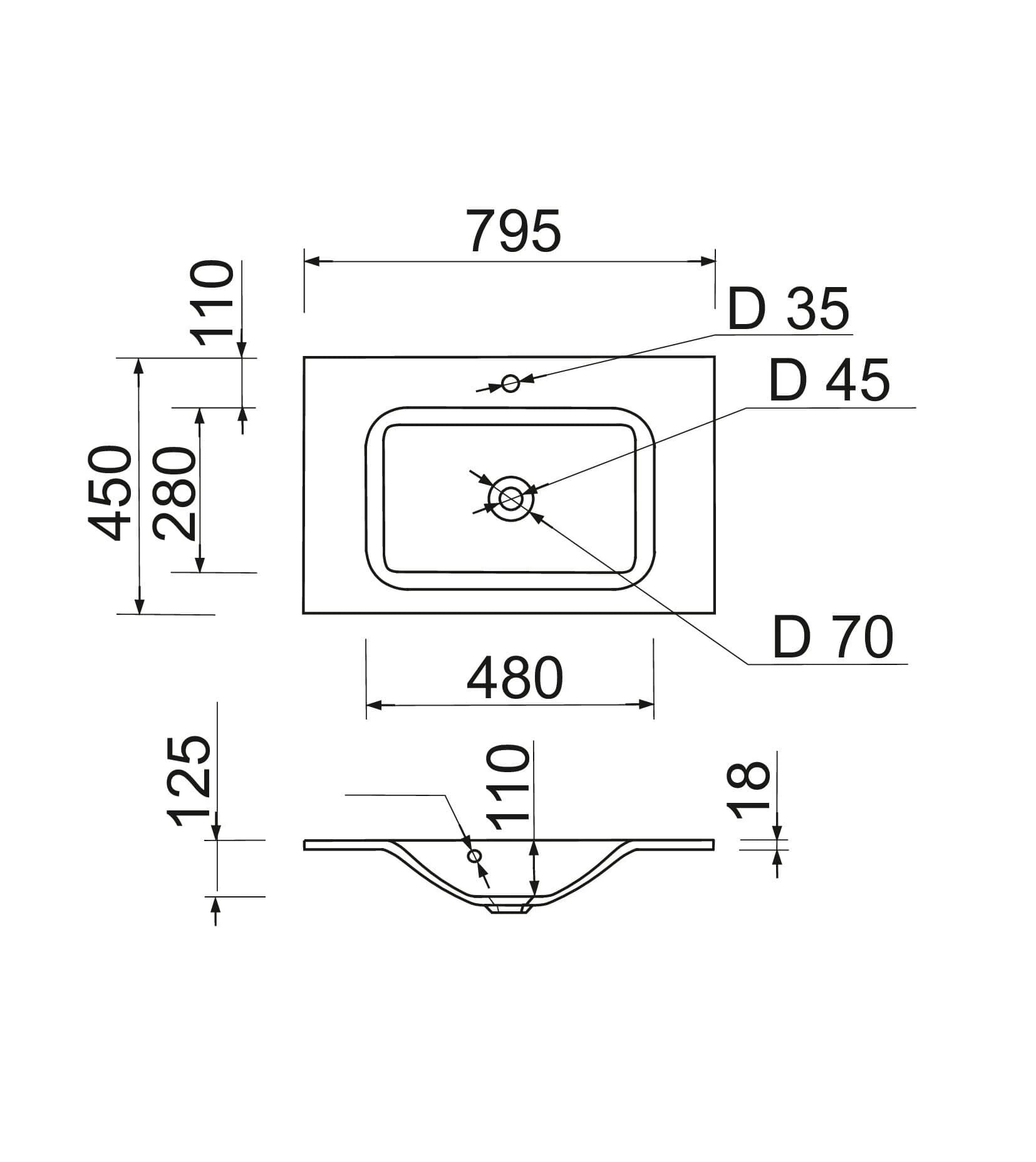 Раковина Adamant FRATE має прямокутну форму, виготовлена зі штучного каменю з розмірами 795 x 450 x 125 мм та білим кольором. Накладний тип встановлення з отворами для змішувача та переливу дозволяє монтаж на тумбу. Матеріал створений за технологією Solid Surface, стійкий до впливу та довговічний.