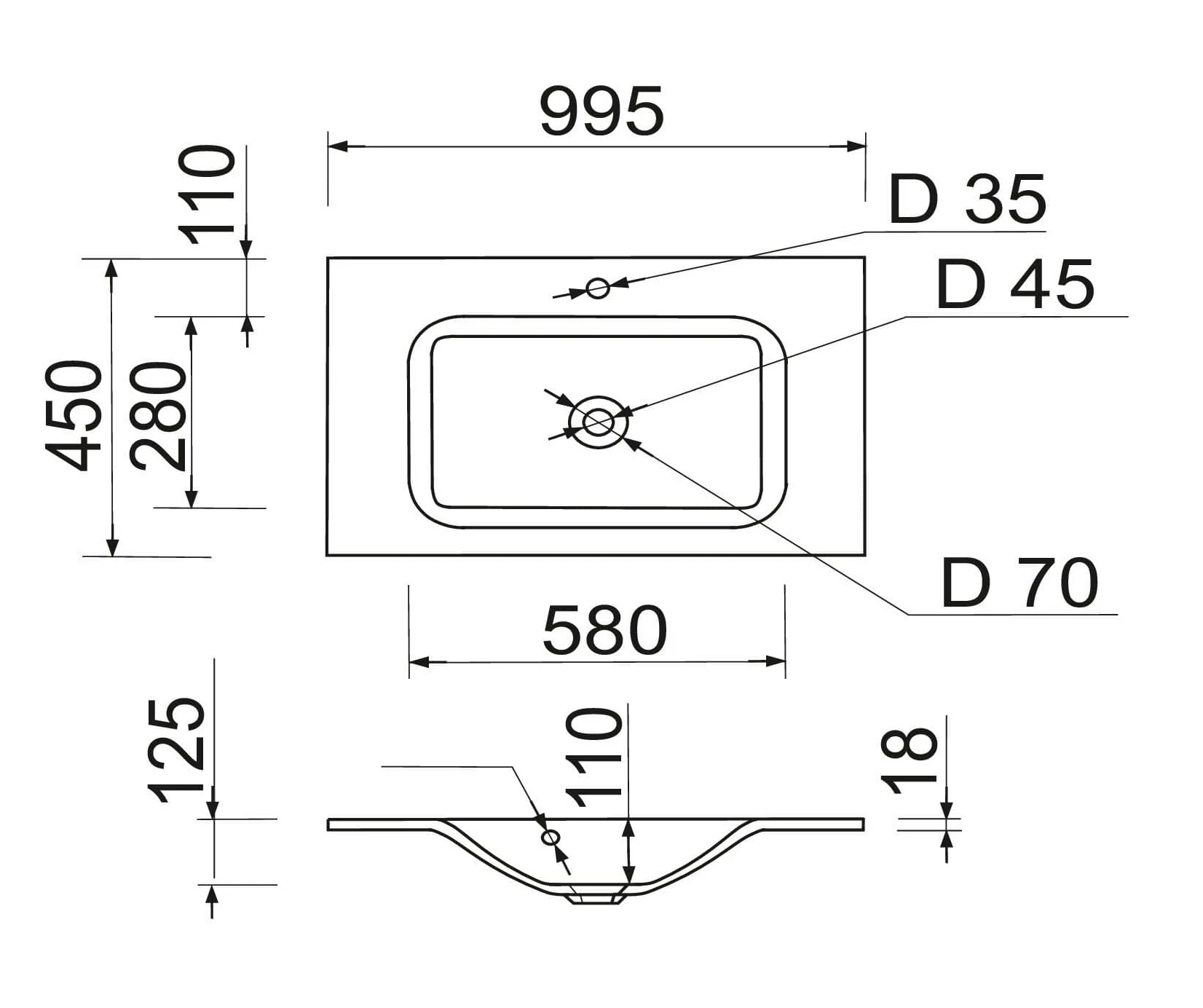 Раковина Adamant FRATE має прямокутну форму, виготовлена зі штучного каменю з розмірами 995 x 450 x 125 мм та білим кольором. Накладний тип встановлення з отворами для змішувача та переливу дозволяє монтаж на тумбу. Матеріал створений за технологією Solid Surface, стійкий до впливу та довговічний.