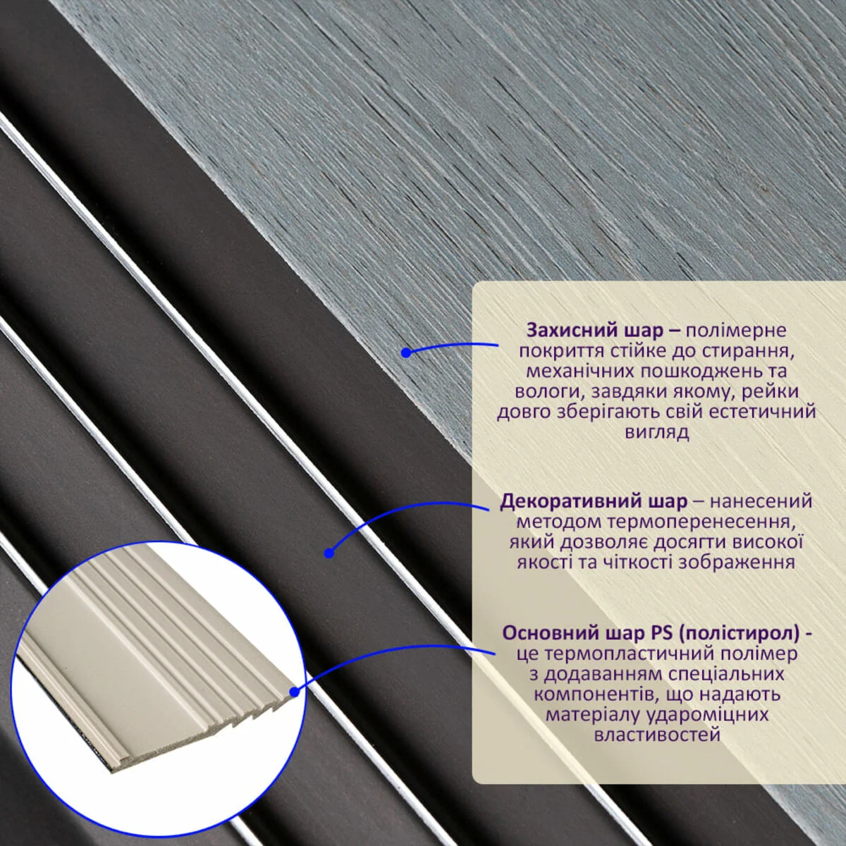 - Захисний шар – полімерне покриття стійке до стирання, механічних пошкоджень та вологи, завдяки якому, рейки довго зберігають свій естетичний вигляд.