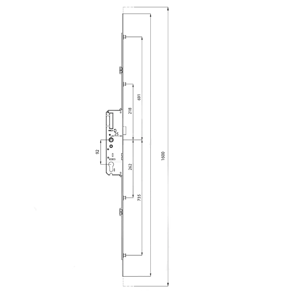 Верхний допуск монтажа 691 мм и рабочая высота узла 218 мм позволяют гибко планировать расположение замка. Расстояние между монтажными прорезями 735 мм обеспечивает надежное крепление к дверной коробке.