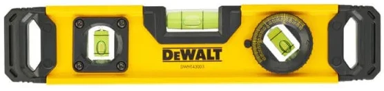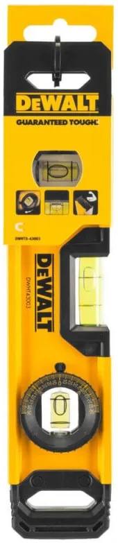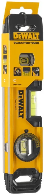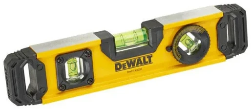 Рівень DeWALT DWHT0-43003 TORPEDO — компактний бульбашковий рівень для точних монтажних робіт. Довжина 23 см зручна для використання у вузьких і важкодоступних місцях. Алюмінієвий корпус поєднує міцність і малу вагу. Три капсули дозволяють контролювати горизонталь, вертикаль і кут 45°. Підходить для електромонтажу, сантехніки та встановлення кріплень.
