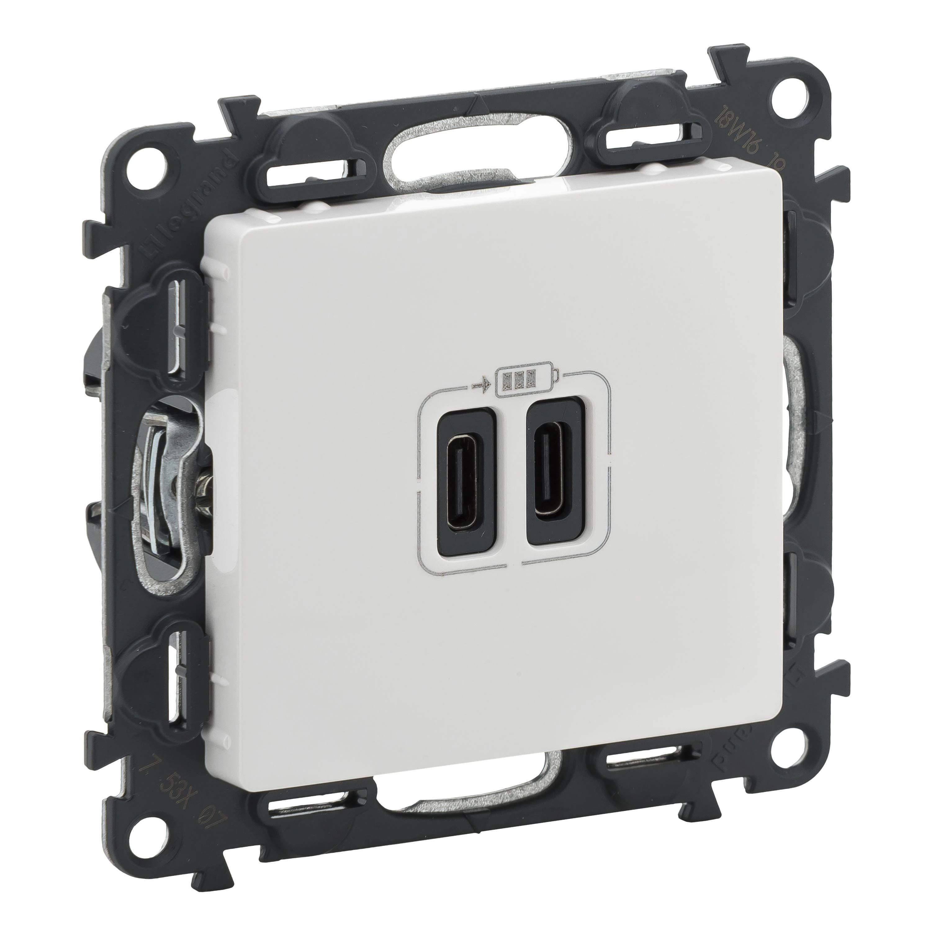 Подвійна розетка Valena Life 753107 призначена як зарядний пристрій потужністю 3 Ампери з 2ма виходами USB тип С. У комплектацію входить: супорт, лицьова панель і зарядних механізм. Залишається підібрати необхідну рамку з колекції Valena Life. Ця нова USB-розетка, більш потужна і, перш за все, більш краще сумісна, як зарядний пристрій. Великий плюс нового механізму – його потужність, 15 Вт, сучасних смартфонів стає все більше, а їх акумулятор вимагає все більше енергії. Особливість заряду: Щоб мати максимальну потужність 3000 мА, ви повинні або використовувати тільки 1 порт USB типу C. Якщо підключити два кабелі, то потужність буде ділитися.