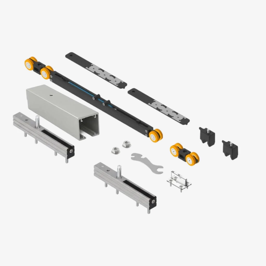 Готовий комплект фурнітури преміум-класу для встановлення одних розсувних дверей. Набір включає інноваційний механізм із подвійним дотягувачем та надійну верхню направляючу Star сріблястого кольору.