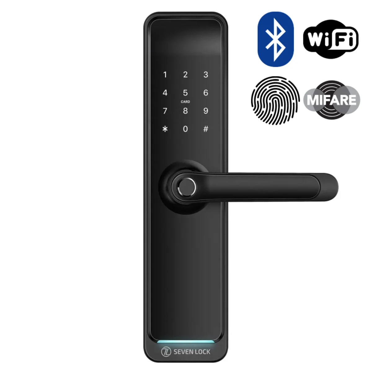 Умный замок SEVEN LOCK SL-7767BFW чёрный — это электронно-биометрический дверной замок с врезной частью типа 6068 с функцией автоматического замыкания. Поддерживает открытие отпечатком пальца, PIN-кодом, RFID-картой/брелоком, через смартфон (Bluetooth и Wi-Fi), а также имеет механический ключ как резервный вариант. Питание от батарей, монтаж без проводов.