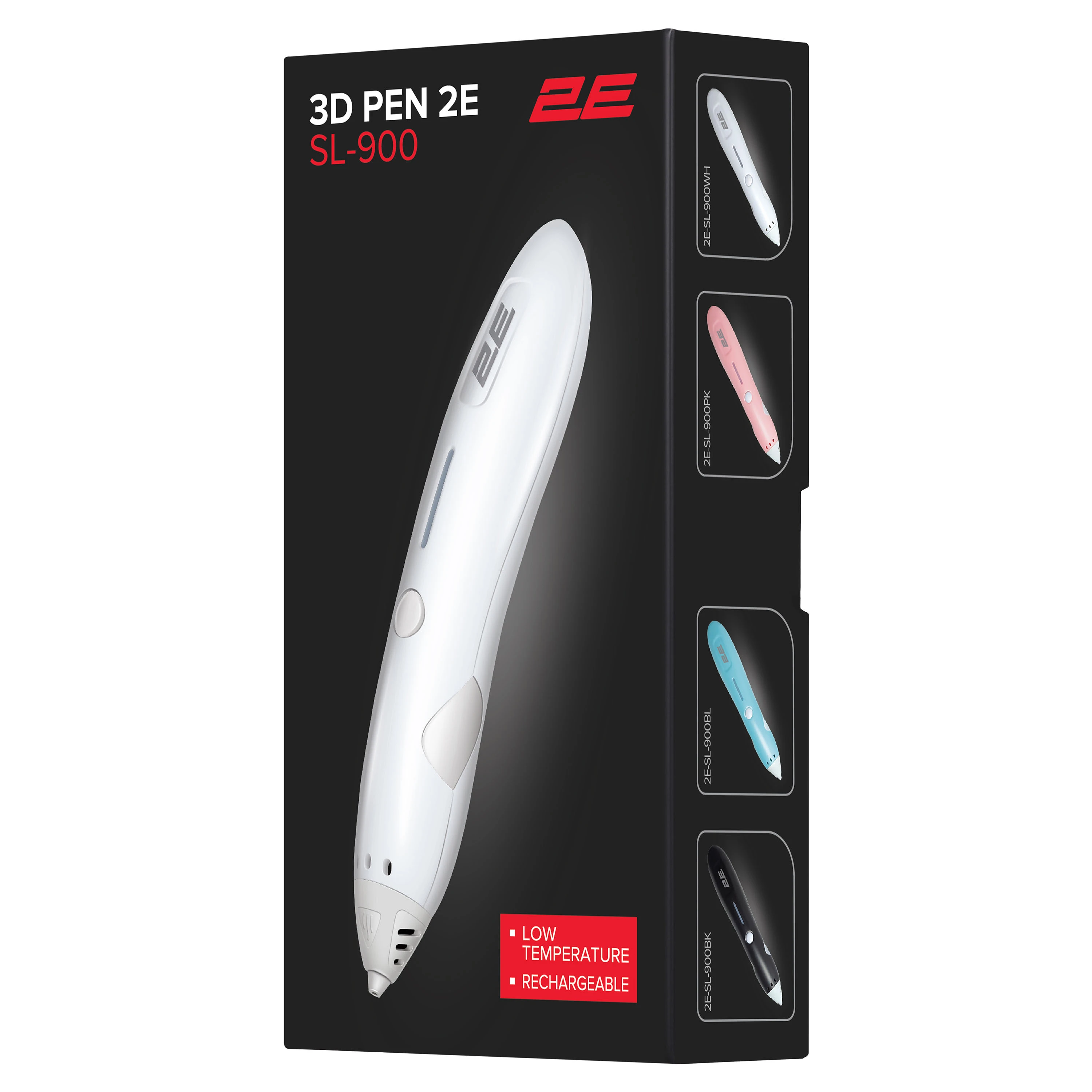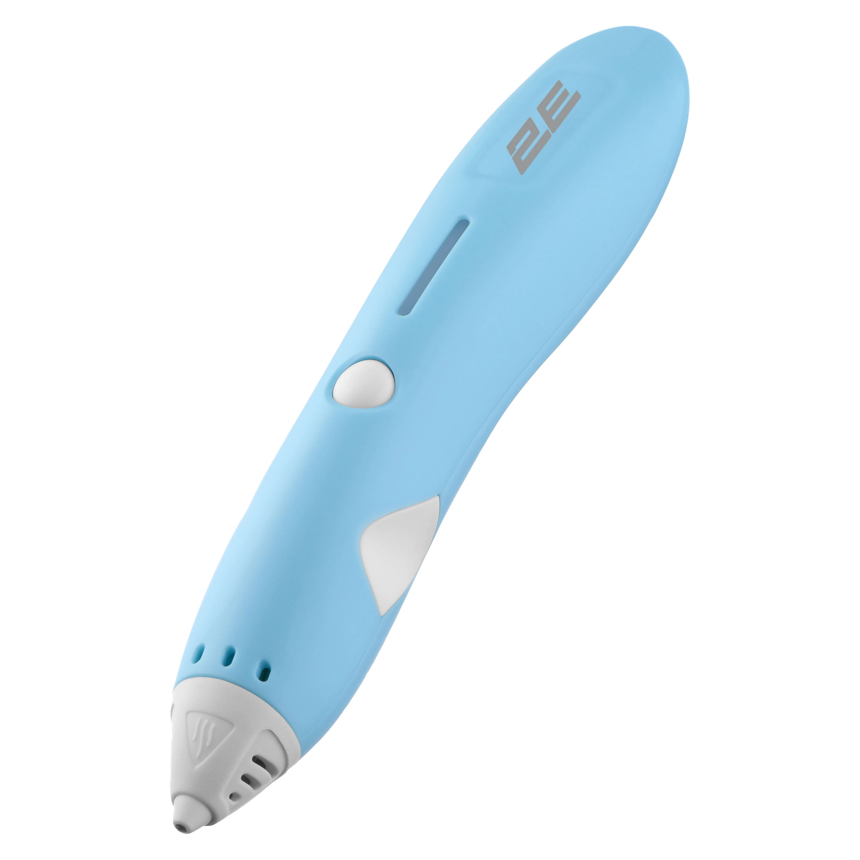 Нова ручка 2Е 3D. Розроблена з витонченим, ергономічним дизайном, що робить її природною для будь-якої руки. Важливою особливістю ручки являється те, що для роботи використовується PCL пластик (1,75 ± 0,02 мм). Цей матеріал є абсолютно безпечним, не має стороннього запаху та плавиться при дуже низьких температурах (+60-70 градусів). Ручка працює від акумулятора ємністю 500 мА·год. Виріб має 2 швидкості роботи.