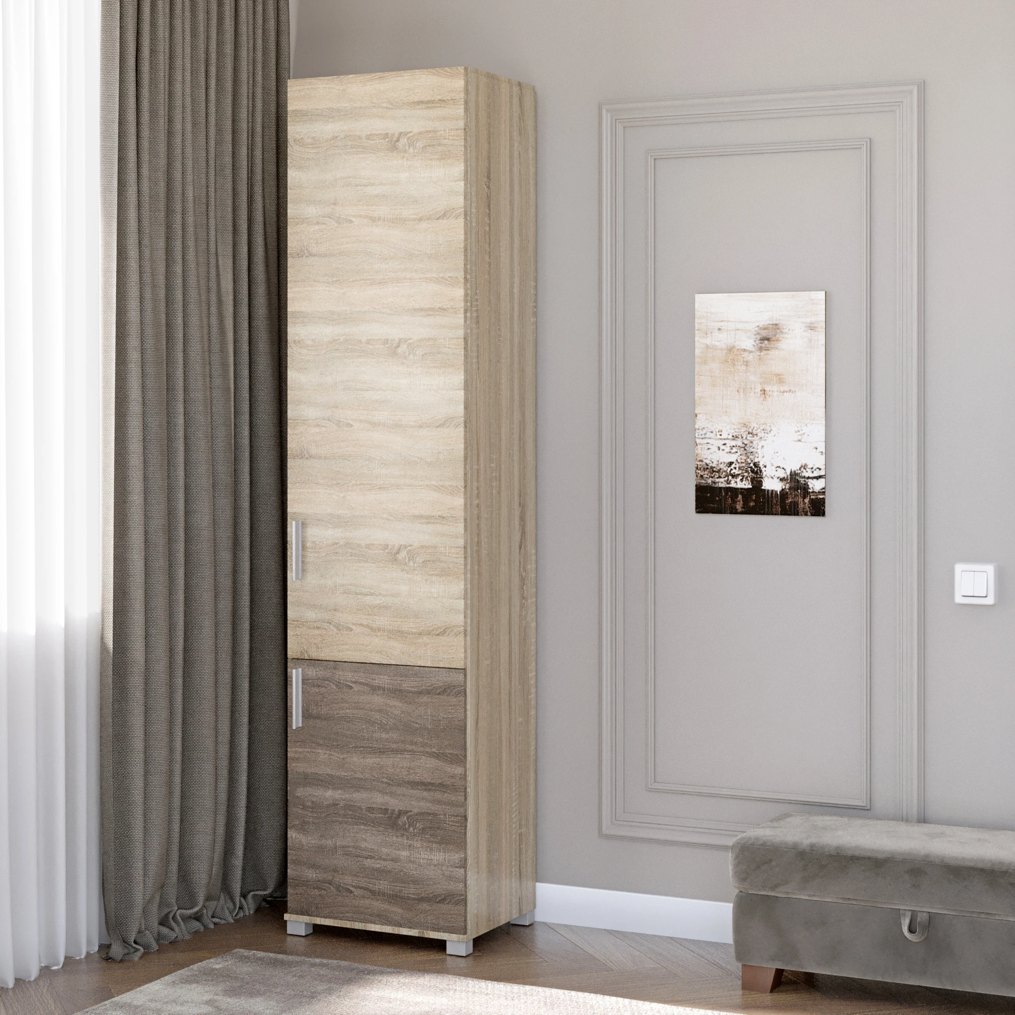 Відкрийте нові можливості для організації простору з шафою-пеналом Еверест Бриз-15. Її елегантний дизайн у кольорах сонома та трюфель створює враження сучасності та затишку. Цей меблевий елемент не лише прикрасить ваш інтер'єр, але й стане ідеальним рішенням для зберігання речей, адже має достатньо місця для всього необхідного. Завдяки закритому дизайну, ваші речі будуть завжди в безпеці та надійно захищені від пилу.