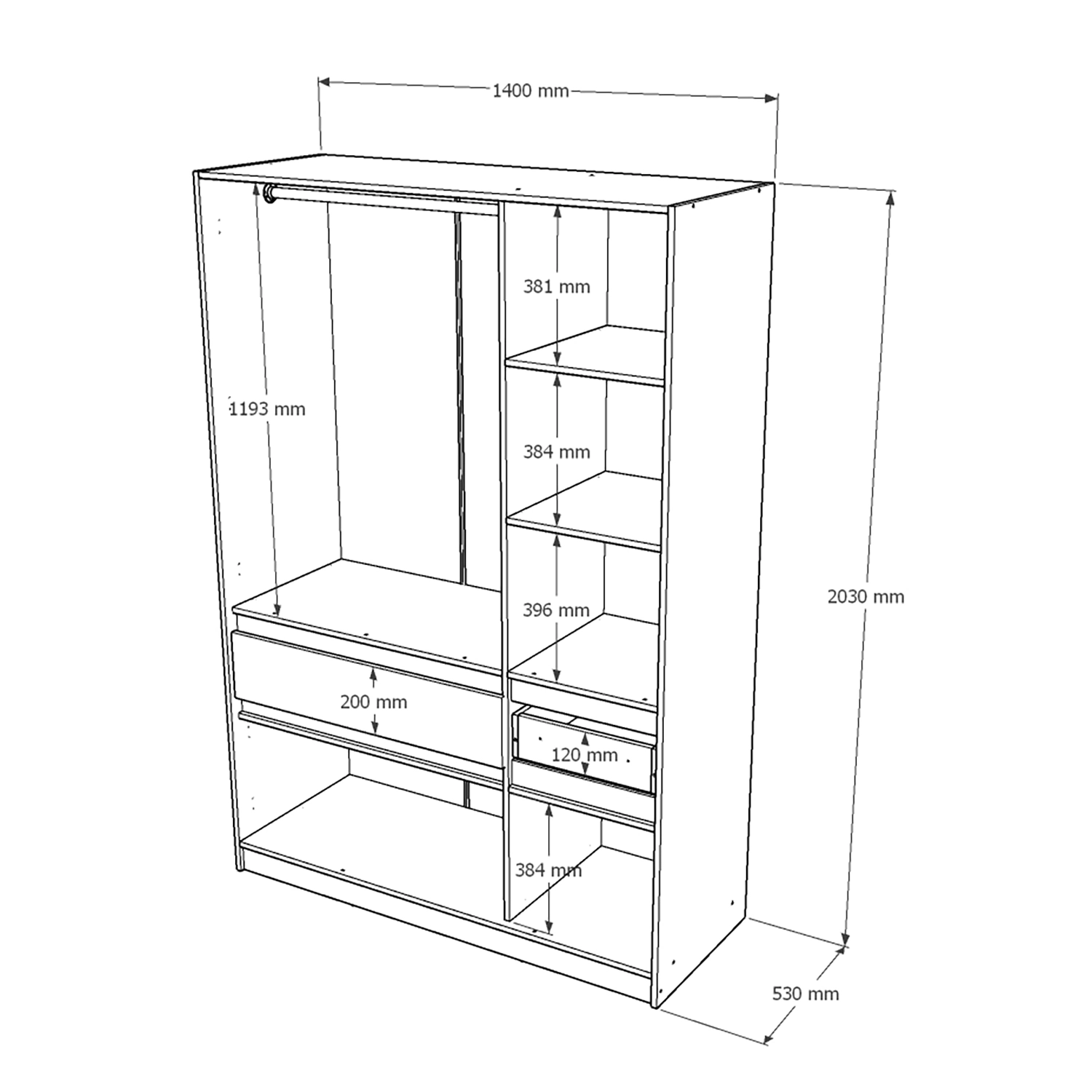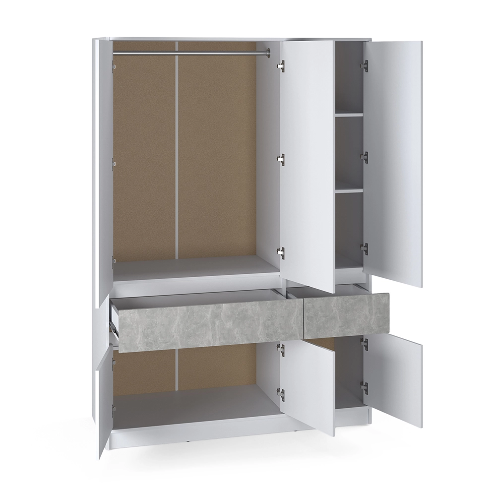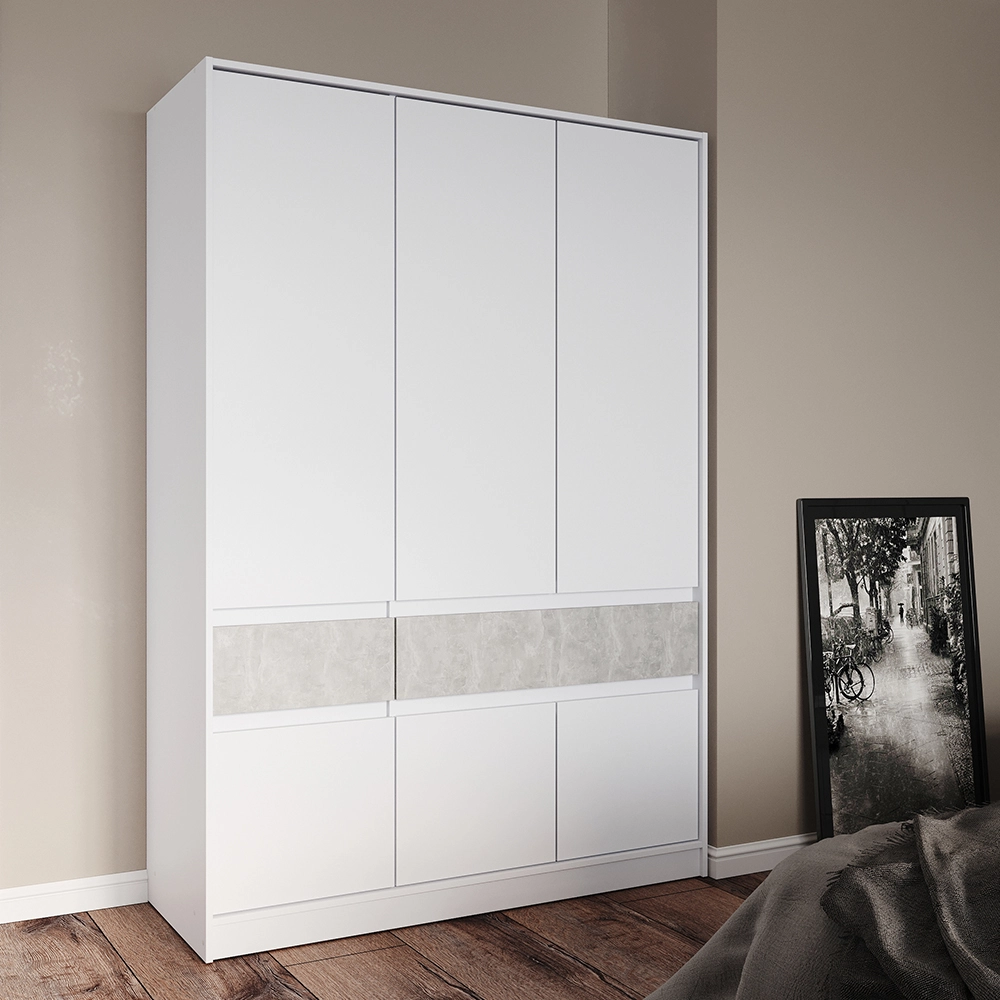 Виготовлена з високоякісного ЛДСП та оснащена кромкою ПВХ, шафа забезпечує надійність і довговічність. Телескопічні напрямні в шухлядах забезпечують плавне та безшумне відкривання, що робить використання шафи максимально комфортним. Ви зможете з легкістю організувати свій простір завдяки продуманій системі зберігання, яка включає штангу для одягу, полиці та місткі ящики.