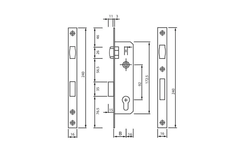 - Габариты лицевой части замка 16х240 мм