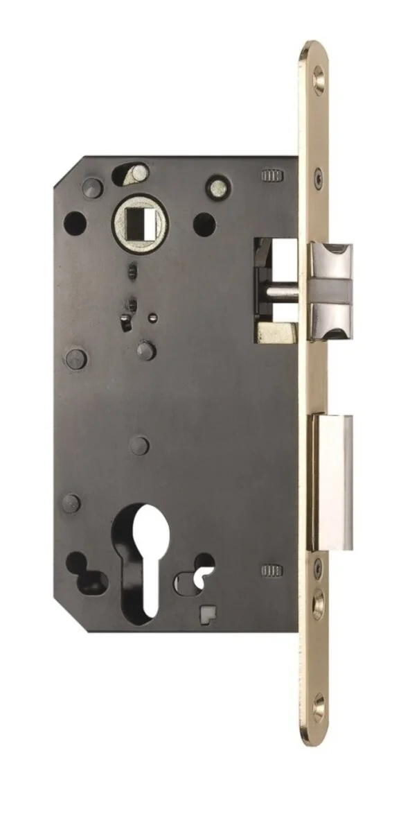 Замок SIBA 10585/P — это врезной механизм с бесшумной защёлкой, предназначенный для межкомнатных дверей. Отверстие под цилиндр отсутствует, поэтому замок используется как фиксационный элемент без запирания на ключ. Корпус изготовлен из прочной стали и покрыт декоративным слоем «латунь полированная» (BP), который придаёт изделию блеск и защищает от коррозии. Размеры 85 мм (межосевое) и 50 мм (дорнмаза) соответствуют стандарту большинства дверных систем.