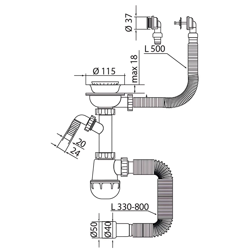 - Комплектация Сифон, гнучка труба 40х40/50 для підключення до ка