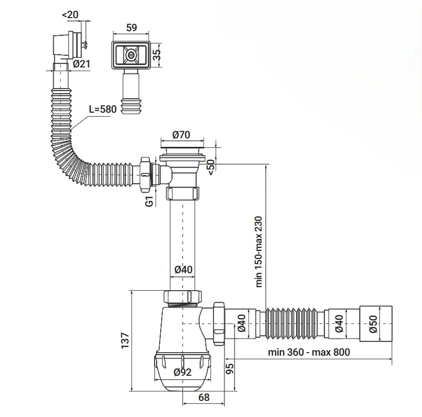 - Комплектация Сифон, гнучка труба 40х40/50 для підключення до ка