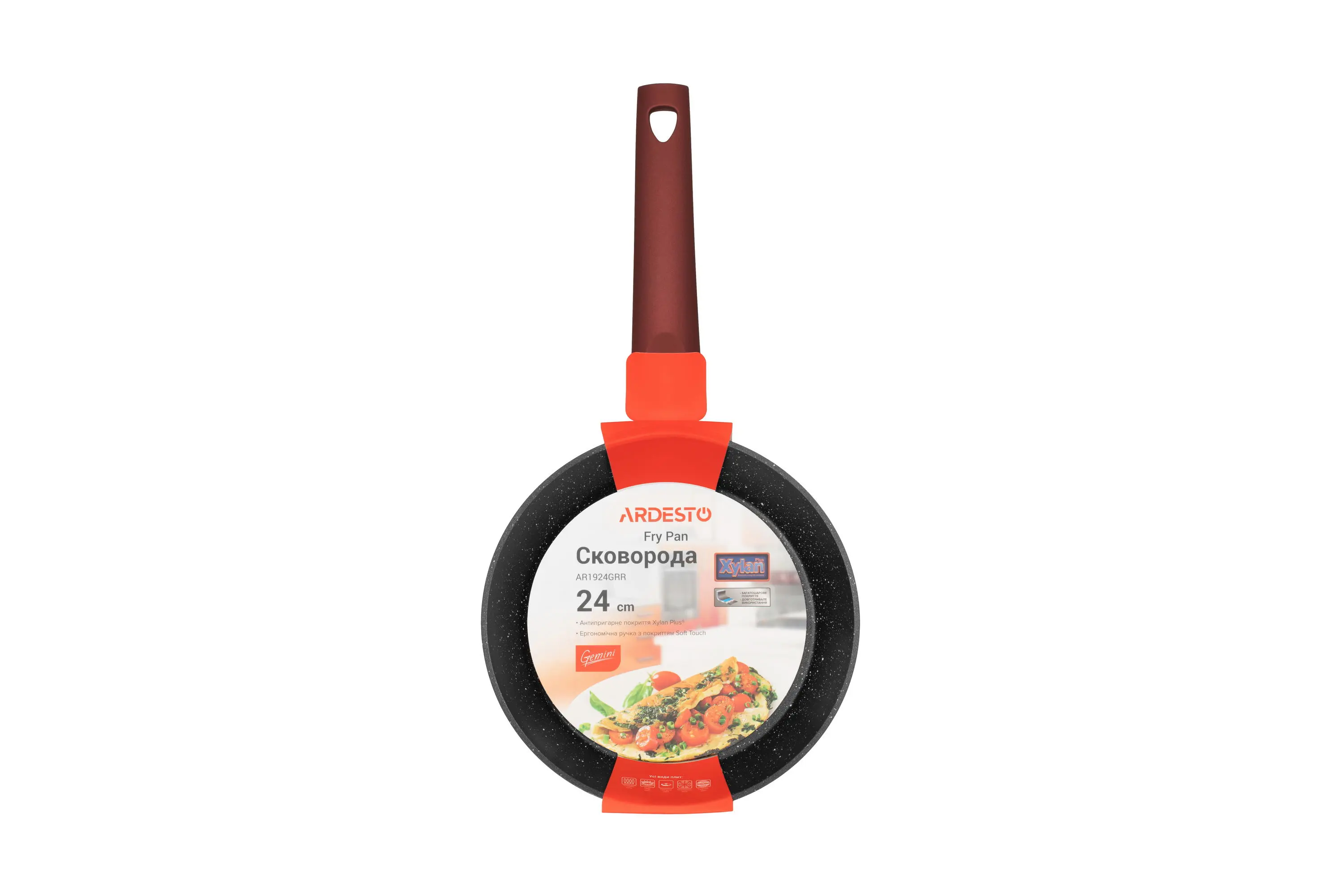 Червону сковороду діаметром 24 см виготовлено з кованого алюмінію та оснащено покриттям Xylan Plus, що має високі антипригарні показники і є стійким до механічних пошкоджень. Висота стінок сковороди – 45 мм, товщина – 2,6/4 мм, товщина дна – 2,6 мм. Ручку вкрито покриттям Soft-touch. Сковороду можна використовувати на газових, електричних, склокерамічних, індукційних та галогенних плитах і не можна мити в посудомийній машині.