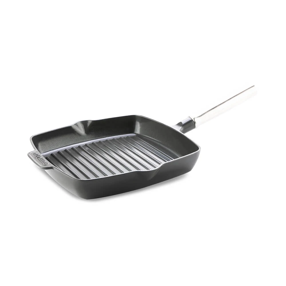 Квадратна алюмінієва сковорода-гриль Greenpan Featherweights 26 см на 50% легша за чавун завдяки алюмінієвому корпусу, виготовленому методом лиття під тиском.