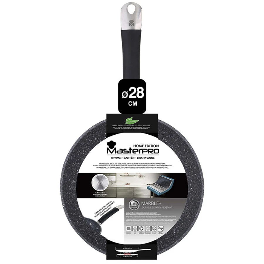 Masterpro Masterpro Home Edition - Сковорода 28 х 5 см. Це кухонний виріб, який належить до колекції Home Edition від Masterpro. Цей бренд відомий тим, що пропонує високоякісні та різноманітні кулінарні інструменти для всіх типів кухарів, а також оптимальну продуктивність в короткостроковій і довгостроковій перспективі! Виготовлена з високоякісного кованого алюмінію, що забезпечує стійкість до корозії та зносу. Цей чудовий матеріал ідеально розподіляє та підтримує тепло по всій поверхні для більшого контролю під час приготування їжі.Оснащена антипригарним покриттям Marble+, яке включає дрібні чорно-білі цятки, що надають унікальний зовнішній вигляд, антипригарне покриття, що не містить токсинів, таких як PFOA! Його ручка, виготовлена з високоякісної нержавіючої сталі, забезпечує зручне та безпечне захоплення виробу, захищеного чорним силіконовим каучуком. І, нарешті, завдяки повністю індукційному дну, можна готувати, заощаджуючи час та енергію! На додаток до сумісності з усіма наявними на ринку плитами, включаючи індукційні, рекомендується ручне миття.
