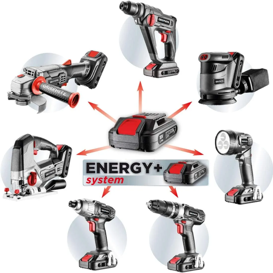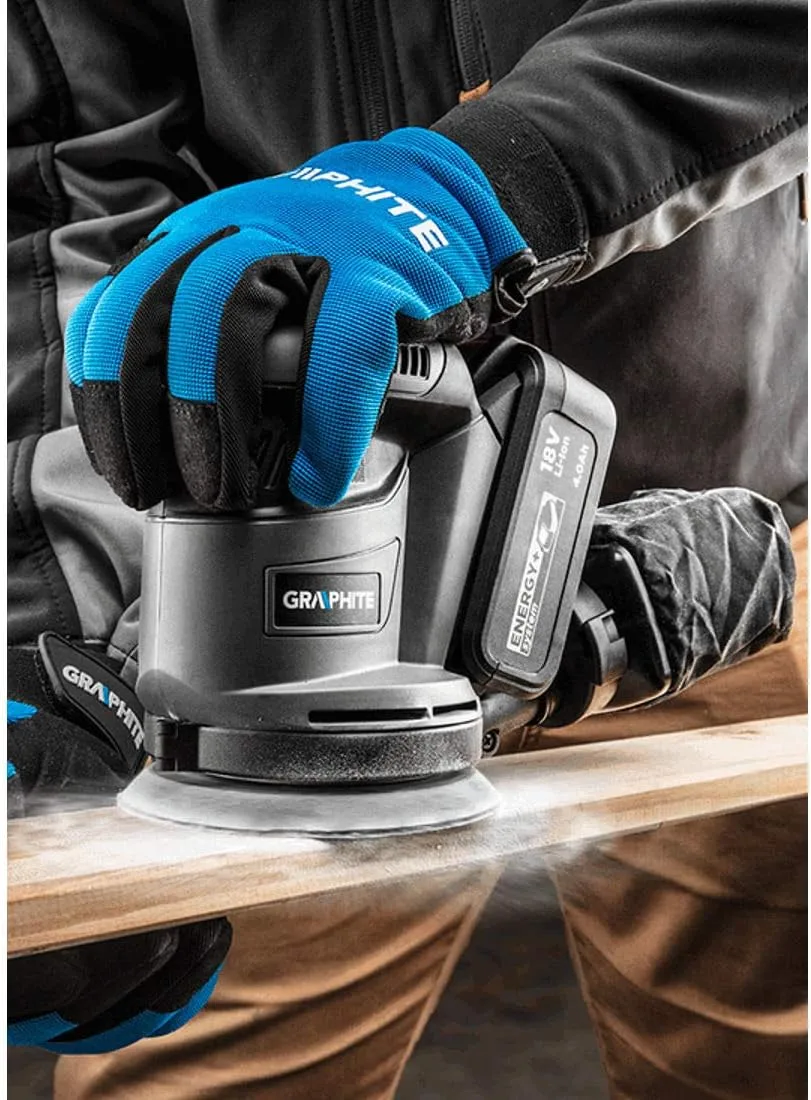 Шліфмашина ексцентрикова GRAPHITE, що працює з акумуляторними батареями 18 В Li-Ion GRAPHITE Energy+. Шліфувальна машина з підошвою діаметром 125 мм, з можливістю кріплення шліфувального паперу на липучку.