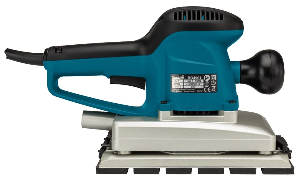 Шліфмашина вібраційна Makita BO4901 — інструмент потужністю 330 Вт з платформою 115×229 мм для шліфування великих площ деревини, металу та пластику. Частота коливань регулюється від 8000 до 20000 кол/хв (4000–10000 об/хв), амплітуда 2,6 мм забезпечує ефективне зняття матеріалу. Вбудована система збору пилу через шліфувальну пластину та можливість підключення пилососа зменшують запилення робочої зони. Ергономічна конструкція з великими затискними важелями полегшує швидку зміну шліфувального паперу. Вага 2,7 кг робить пристрій зручним для тривалої роботи.