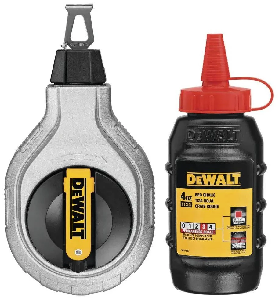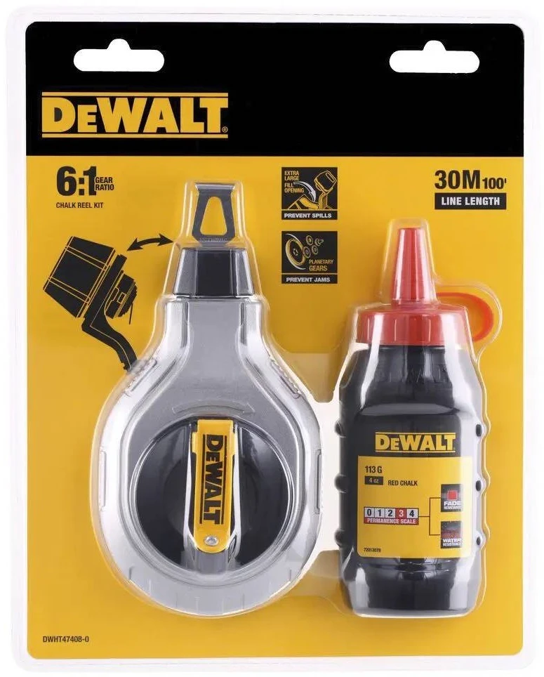 Шнур розмічальний DeWALT, 30м, фіксація шнура, підвісний рівень та крейда