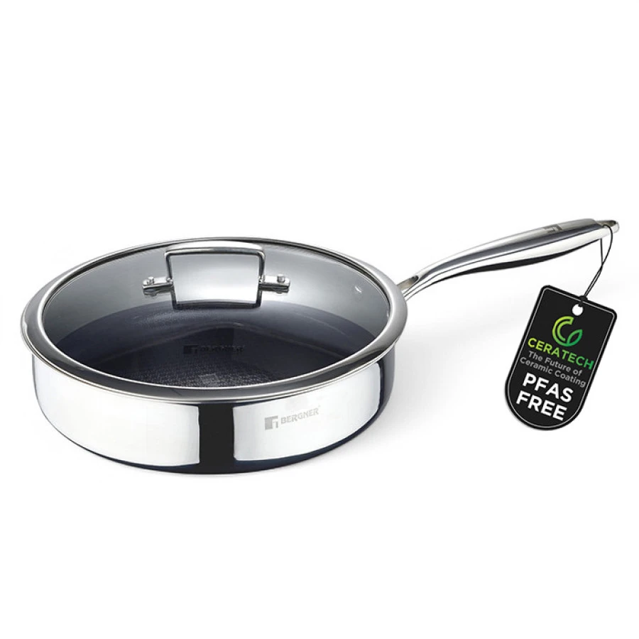 Точність, довговічність і стиль на вашій кухні! Сотейник з кришкою 28 см створеный для тих, хто вимагає найкращого. Її тришарова структура, що поєднує алюміній і нержавіючу сталь, забезпечує на 35% швидший і рівномірніший розподіл тепла, що ідеально підходить для ефективного і точного приготування їжі. Внутрішня частина має надміцне антипригарне покриття CERATECH, що пропонує інноваційну поверхню, яка ідеально підходить для обсмажування, підрум'янювання і збереження смаку ваших страв. Міцна скляна кришка дозволяє контролювати процес приготування без втрати тепла, а ручка з покриттям Cool-Touch забезпечує безпеку і комфорт під час використання. Завдяки сучасному дизайну з блискучої нержавіючої сталі сотейник вирізняється не тільки функціональністю, але й стилем. Він сумісний з усіма типами плит: індукційними, газовими, електричними, галогенними та склокерамічними. Для подовження терміну служби рекомендується ручне миття.