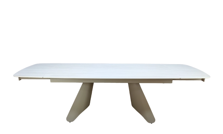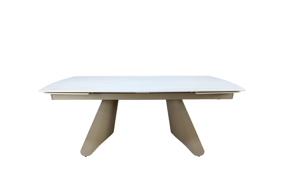 Розкладний обідній стіл Кармен — це поєднання витонченого дизайну, міцних матеріалів і зручної функціональності. Модель у теплому бежевому матовому кольорі виглядає елегантно й водночас практично. Завдяки розкладному механізму з двома вставками по 40 см, стіл легко трансформується з 1800 мм до 2600 мм, забезпечуючи комфортне місце для 8–10 осіб. Його стриманий дизайн із металевими ніжками у відтінку тауp органічно вписується у сучасні інтер'єри кухні чи вітальні.