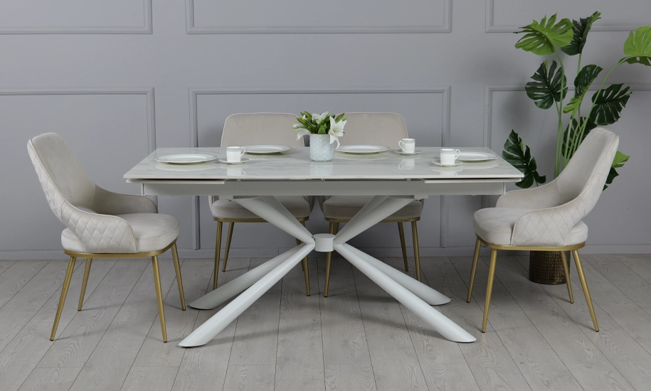 Обідній розкладний стіл Рим виділяється дизайнерською основою та вишуканою стільницею з ефектом натурального мармуру. Має практичний розкладний механізм, який дозволяє збільшити довжину завдяки двом боковим вставкам по 400 мм кожна. У розкладеному вигляді він досягає 2400 мм, що робить його ідеальним для великих сімейних обідів та святкових подій.