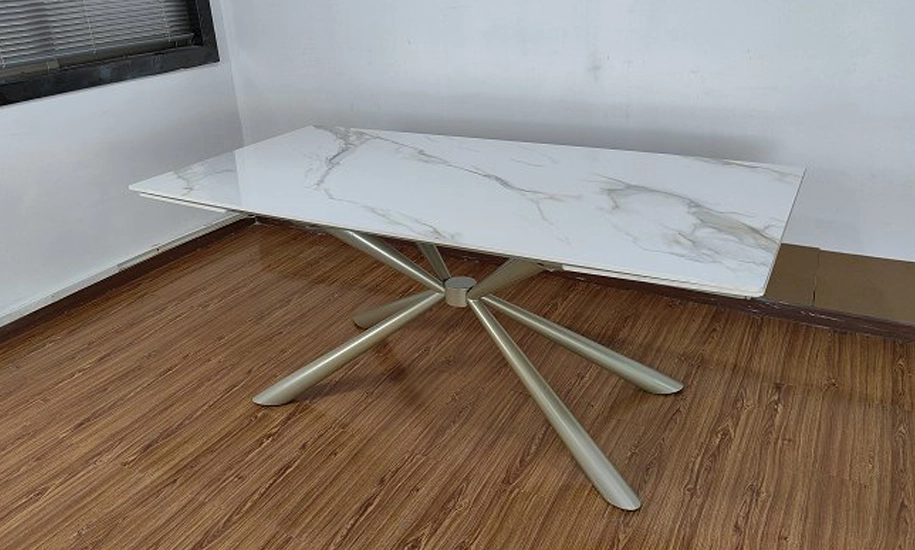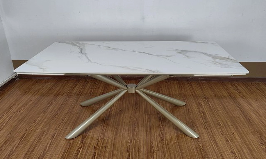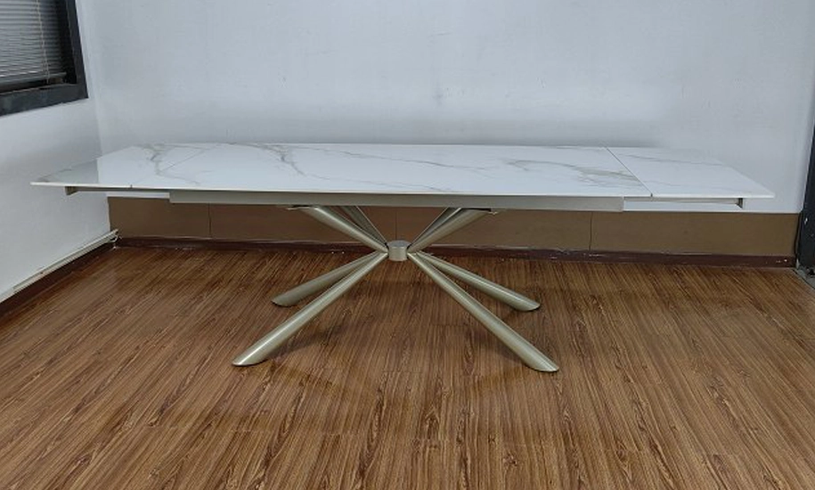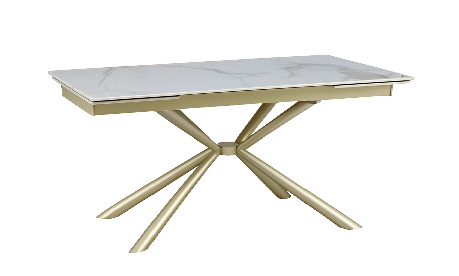 Розкладний обідній стіл Рим зачаровує глянцевою керамічною стільницею білого кольору з ніжним бежевим відтінком, що підкреслює його елегантний вигляд. А його металеві ніжки у відтінку шампань створюють елегантний акцент та забезпечують стабільність конструкції. Завдяки розкладному механізму стіл легко трансформується, збільшуючи довжину до 2600 мм для великих зустрічей чи родинних обідів. Такий стіл стане стильним рішенням для сучасних інтер’єрів кухні або вітальні.