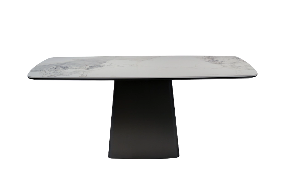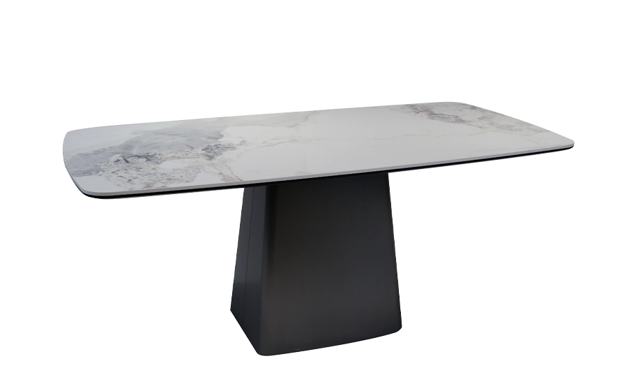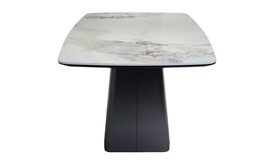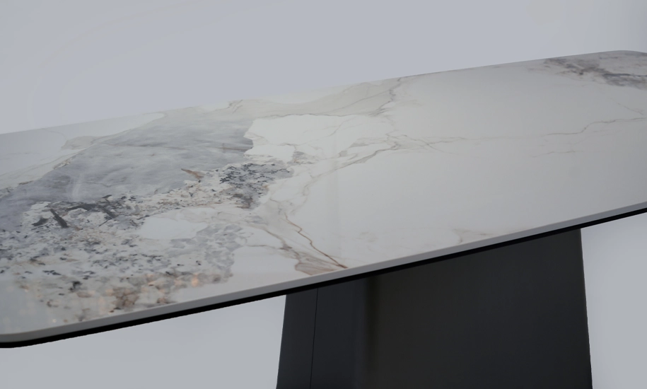 Стіл Титан одразу привертає увагу завдяки стільниці з білої глянцевої кераміки з ефектним візерунком у стилі Chanel. Його масивна основа з чорного МДФ надає конструкції солідності, а матована металева нога в кольорі графіт створюють стильний контраст.
