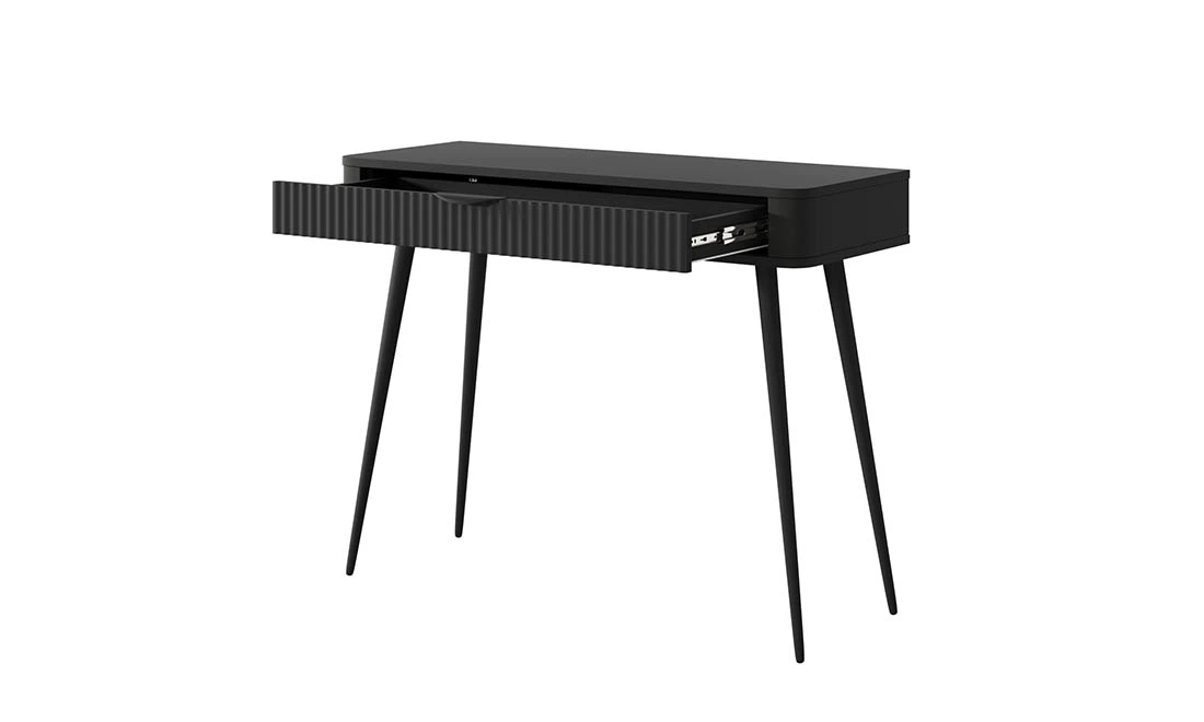 Туалетний стіл Лагуна - це поєднання естетики та функціональності, створений для сучасних інтер'єрів. Корпус із ламінованої ДСП з заокругленими кутами з МДФ забезпечує тривалу експлуатацію та безпечність використання. Фасади з МДФ представлені у двох кольорах — бежевому або чорному, а відкриті вітрини мають колір кашеміру з текстурою дерева, що додає тепла та затишку до дизайну. Стильні металеві ручки та ніжки золотого кольору надають меблям витонченого вигляду.