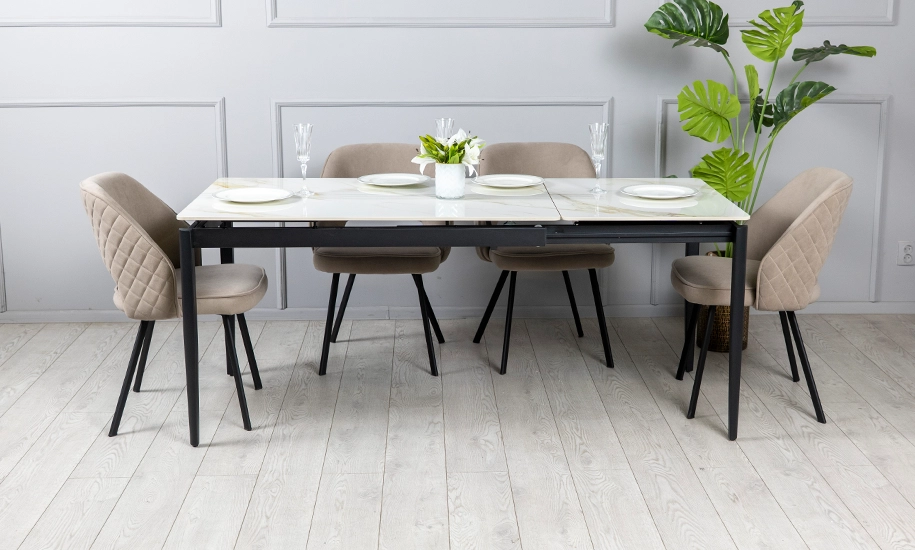Стільниця з молочним глянцевим покриттям створює світлий, візуально легкий акцент в інтер’єрі. Завдяки розкладному механізму, довжина столу змінюється з 1200 до 1800 мм — ідеально для прийому гостей.