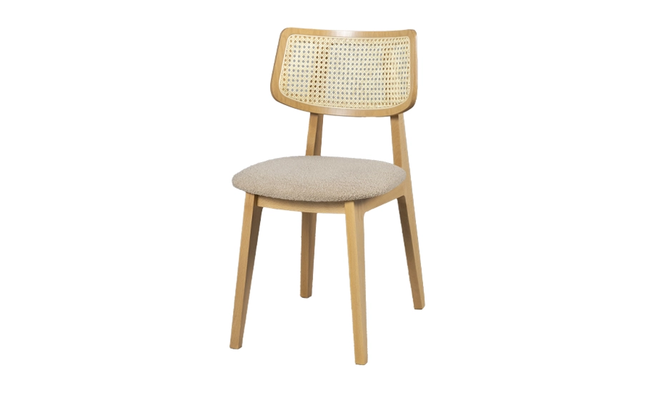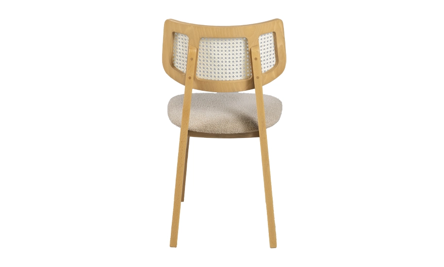 - Спинка виготовлена з гнутої клеєної деревини (ГКД), покритої шпоном бука, та доповнена декоративною вставкою з натурального ротангу. Цей елемент не лише виконує декоративну функцію, а й забезпечує природну вентиляцію спини, що особливо приємно у теплу пору року.