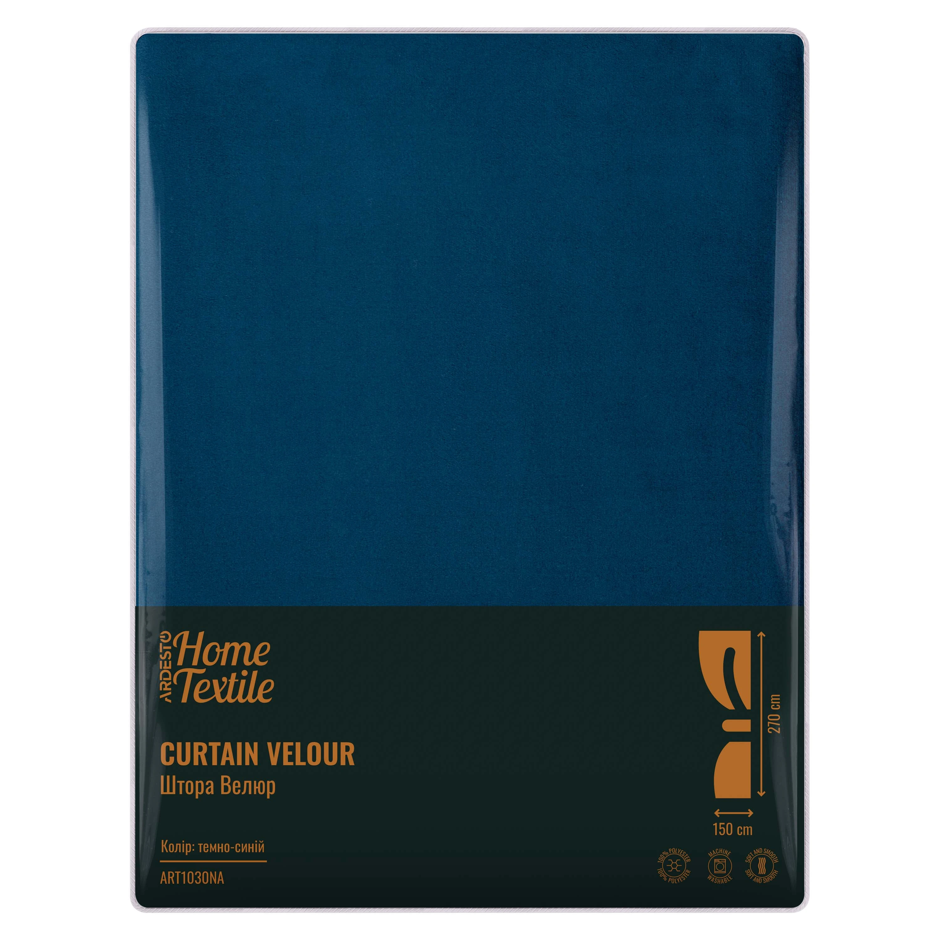 Штора ARDESTO з велюру темно-синього кольору є елегантним і вишуканим елементом декору для віконного простору. Виготовлена з довговічного 100 % поліестеру штора має гладеньку текстуру, щільна, важка та добре захищає від сонячних променів. Розмір виробу становить 150 × 270 см.