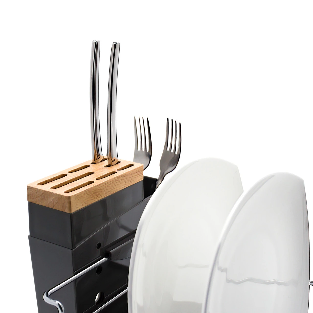 Завдяки широкому дну та вставці для приладів — зручно сушити навіть великі тарілки. Сірий колір додає стриманого стилю кухонному простору.