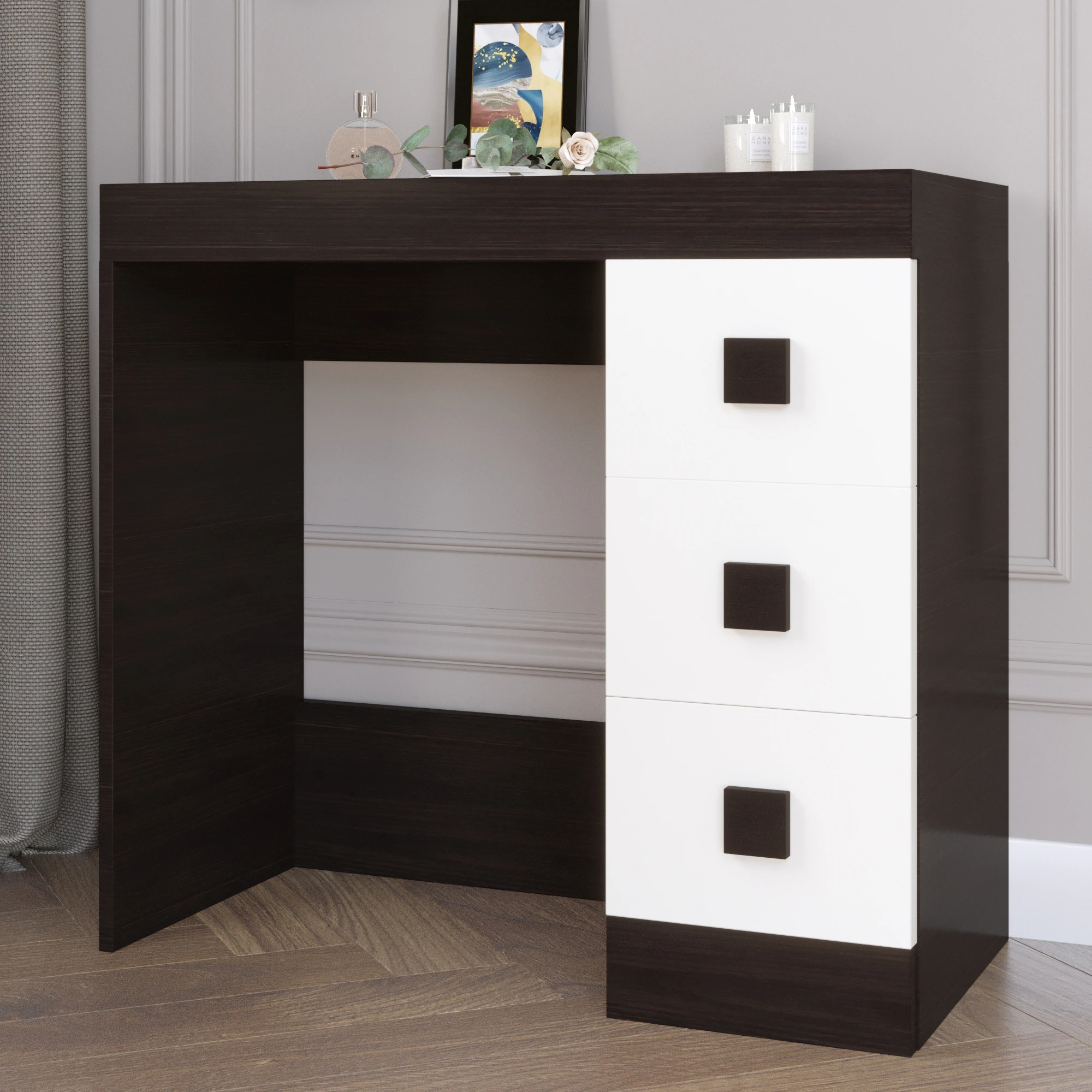 Відкрийте для себе ідеальне поєднання елегантності та практичності з туалетним столиком Соната Еверест. Цей стильний меблевий елемент в темному венге та білому кольорі додасть вашій кімнаті сучасного вигляду, створюючи затишну атмосферу для вашого ритуалу краси. Завдяки продуманому дизайну, ви зможете легко організувати всі свої косметичні засоби та аксесуари, що робить підготовку до виходу з дому ще більш приємною.