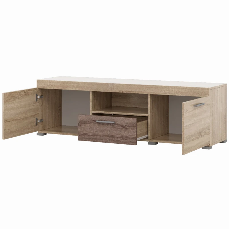 Не пропустіть можливість підкреслити свій стиль! Тумба виготовлена в сучасному кольорі сонома з трюфельними акцентами, що робить її універсальним елементом для будь-якого інтер'єру. Завдяки продуманій конструкції, вона забезпечує достатньо місця для зберігання техніки та аксесуарів, а також легкий доступ до них. Обираючи Тумбу Еверест ТВ 1500, ви отримуєте не лише стильний елемент меблів, але й практичне рішення для вашої вітальні, яке поєднує елегантність, функціональність та надійність!
