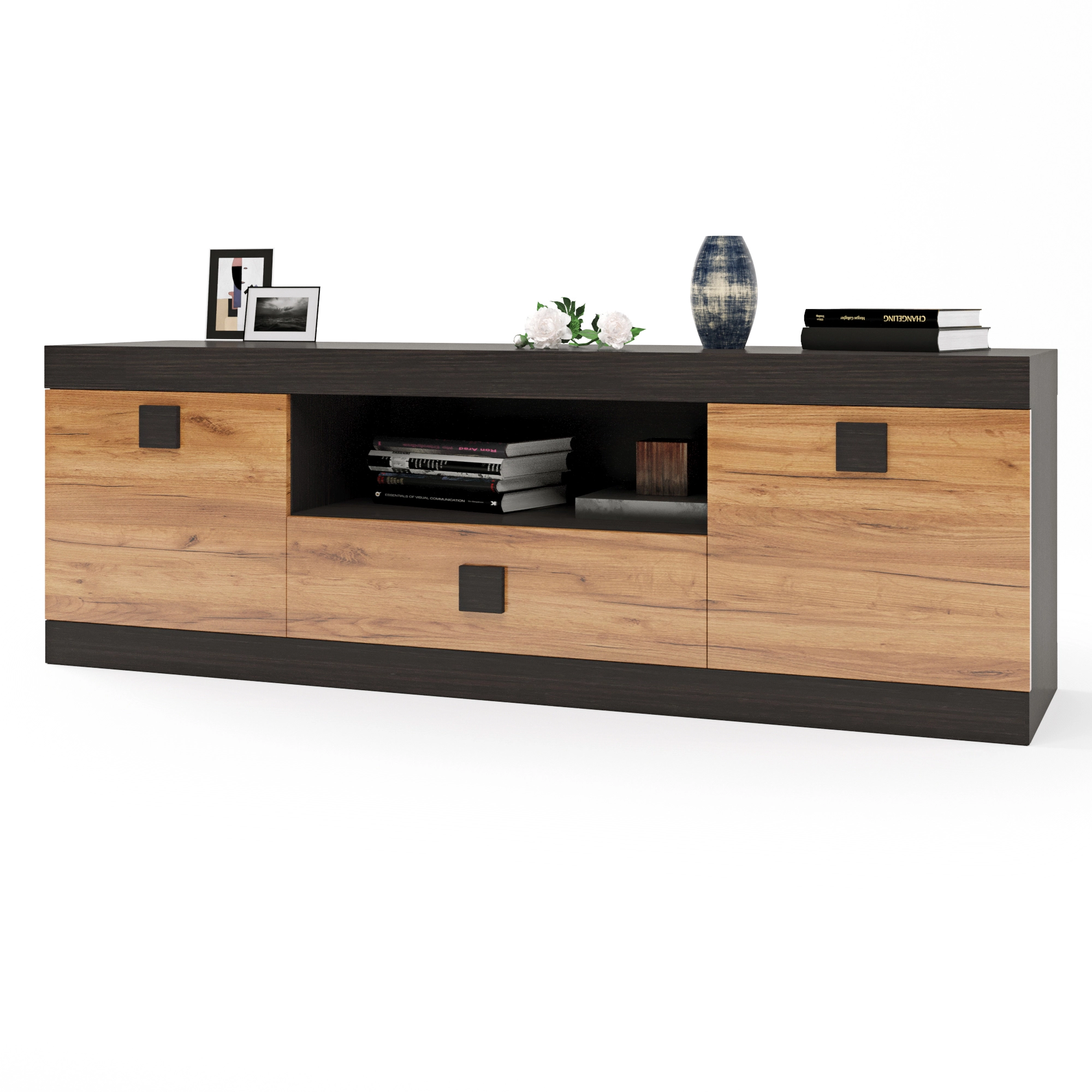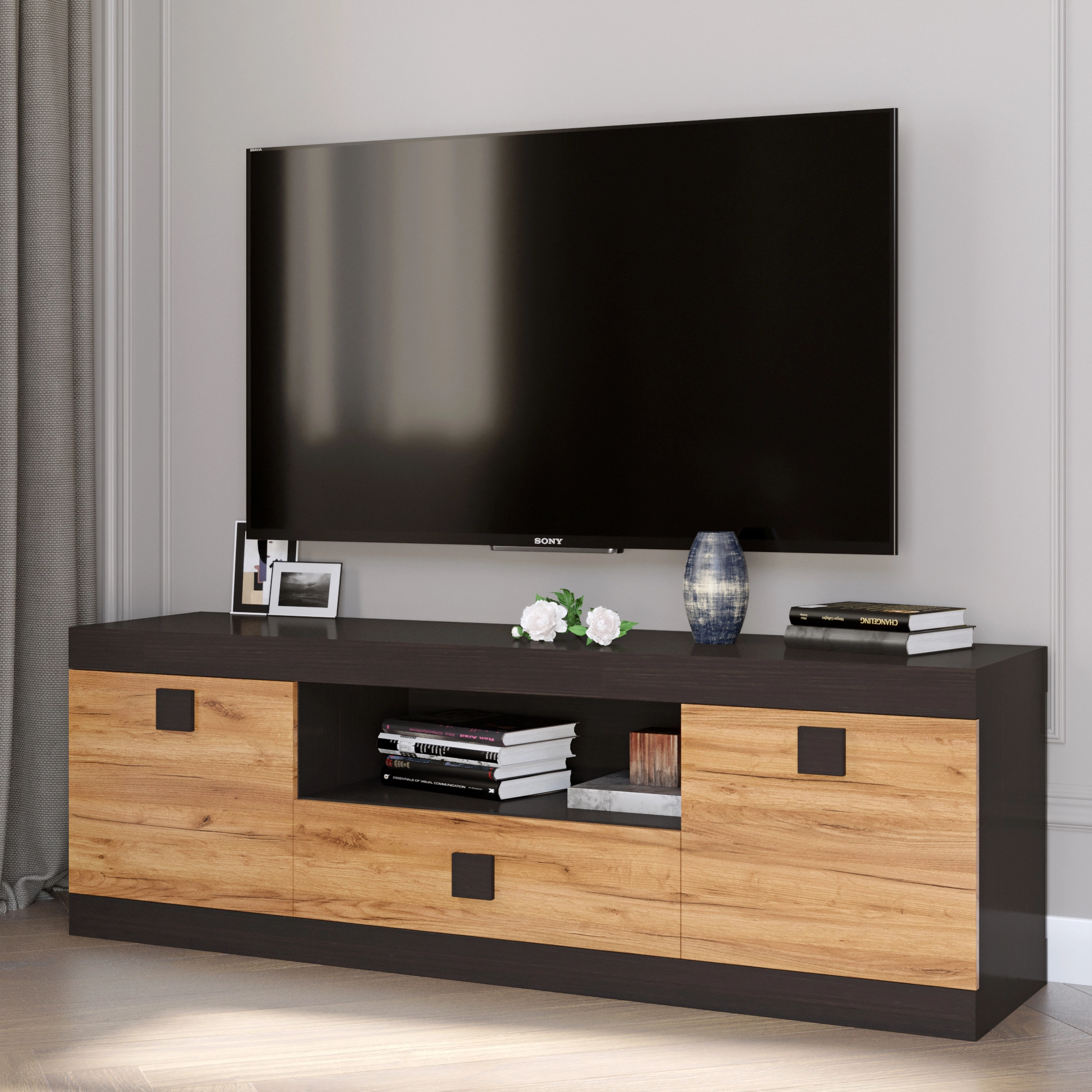 Відкрийте для себе ідеальне поєднання елегантності та практичності з тумбою Еверест ТВ 1500. Її стильний дизайн у темному венге та дубі крафт золотому додасть шарму будь-якому інтер'єру, створюючи затишну атмосферу у вашому домі. Завдяки продуманим розмірам, ця тумба ідеально впишеться у ваш простір, забезпечуючи комфортне місце для розміщення телевізора та інших медіапристроїв.
