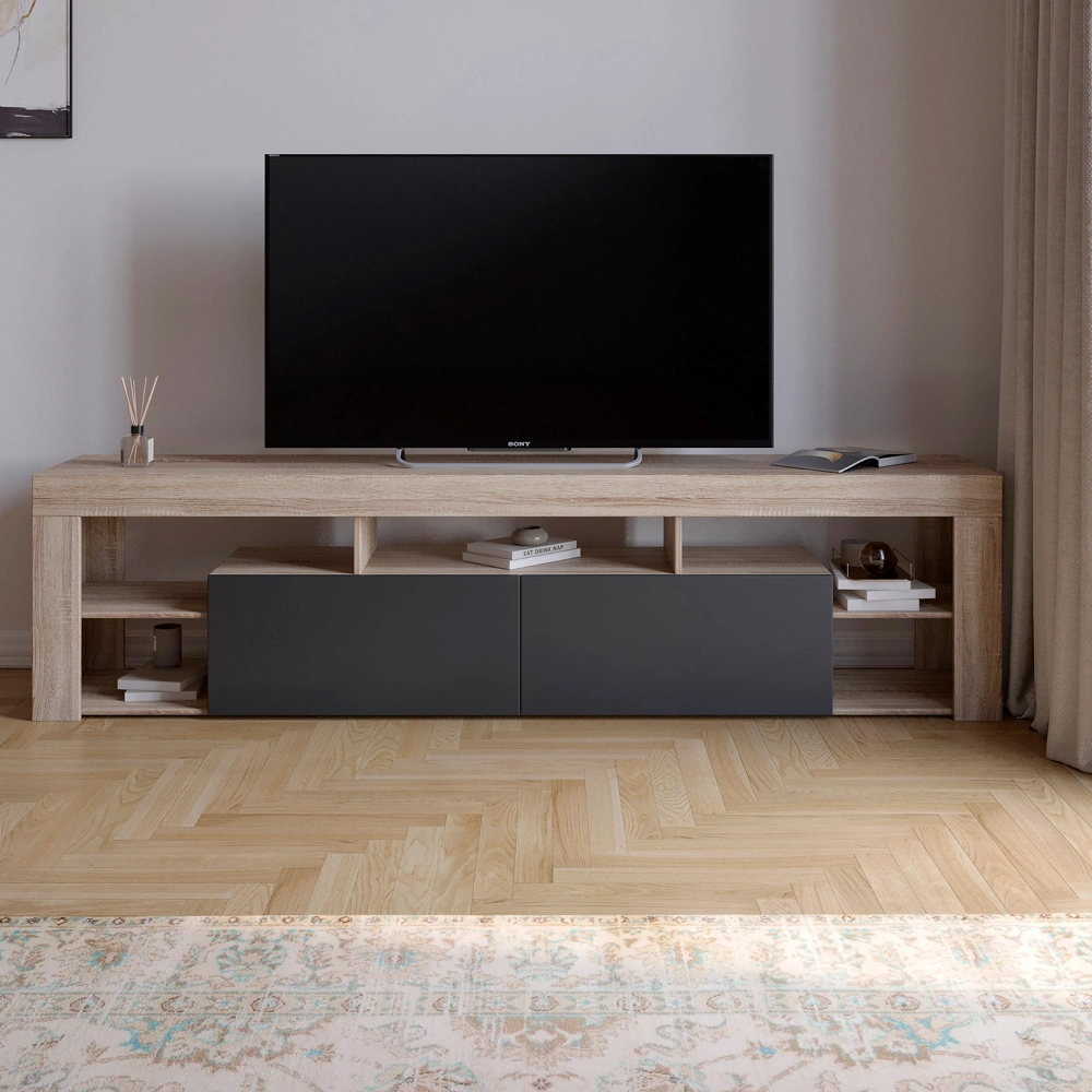 Тумба під телевізор М-ЗОН Джеко 200 в кольорі Дуб сонома/Антрацит — це стильне та функціональне рішення для вашої вітальні або зони відпочинку. Завдяки поєднанню світлого дуба сонома і глибокого антрациту, тумба виглядає сучасно і додає інтер'єру елегантності. Її ширина 200 см дозволяє зручно розмістити телевізор великого формату, а п'ять відкритих поличок дозволяють організувати простір для зберігання медіаобладнання, книг або декоративних елементів.