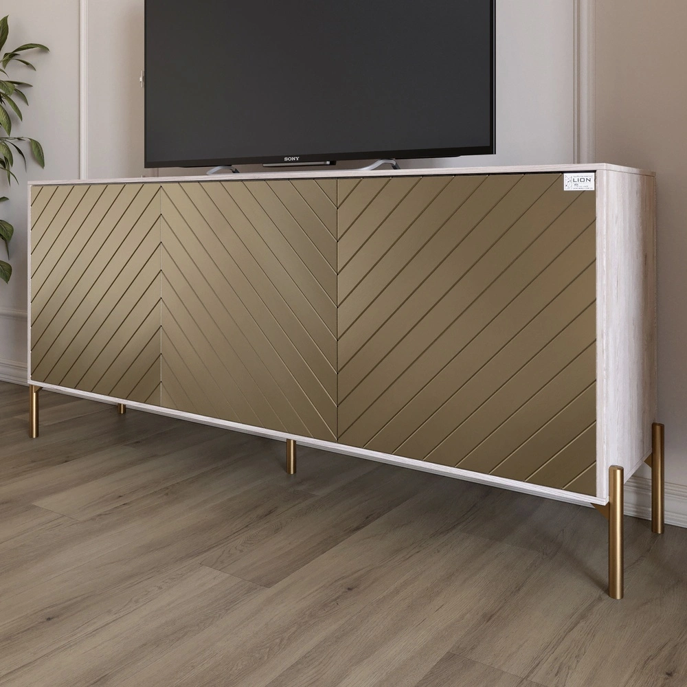 Золотые металлические ножки придают изделию не только эстетическую привлекательность, но и стабильность. Они обеспечивают надежную поддержку, что делает тумбу идеальным выбором для любого телевизора. Размеры 168x40x76,5 см позволяют разместить все ваши электронные устройства, обеспечивая при этом достаточно простора для декора.