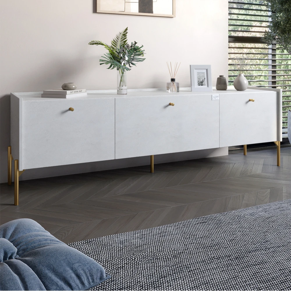 С тремя просторами для хранения, эта тумба позволяет организовать ваши вещи так, чтобы все было под рукой. Вы сможете легко хранить телевизионные аксессуары, игры или даже книги, не жертвуя эстетикой вашего пространства. Золотые ножки придают особый шарм, подчеркивая роскошный вид мебели.
