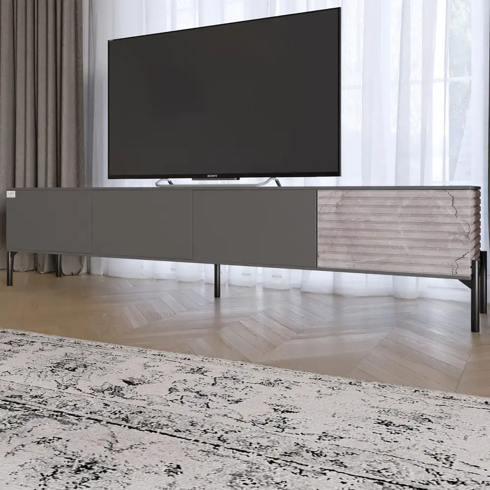 Благодаря своему уникальному цвету Грей Антрацит и текстуре Камень, эта тумба легко впишется в любой интерьер — от классического до современного. Она предназначена для тех, кто ценит стиль и эстетику. Ваша гостиная или медиа-зона приобретет новый вид, став более уютной и стильной.