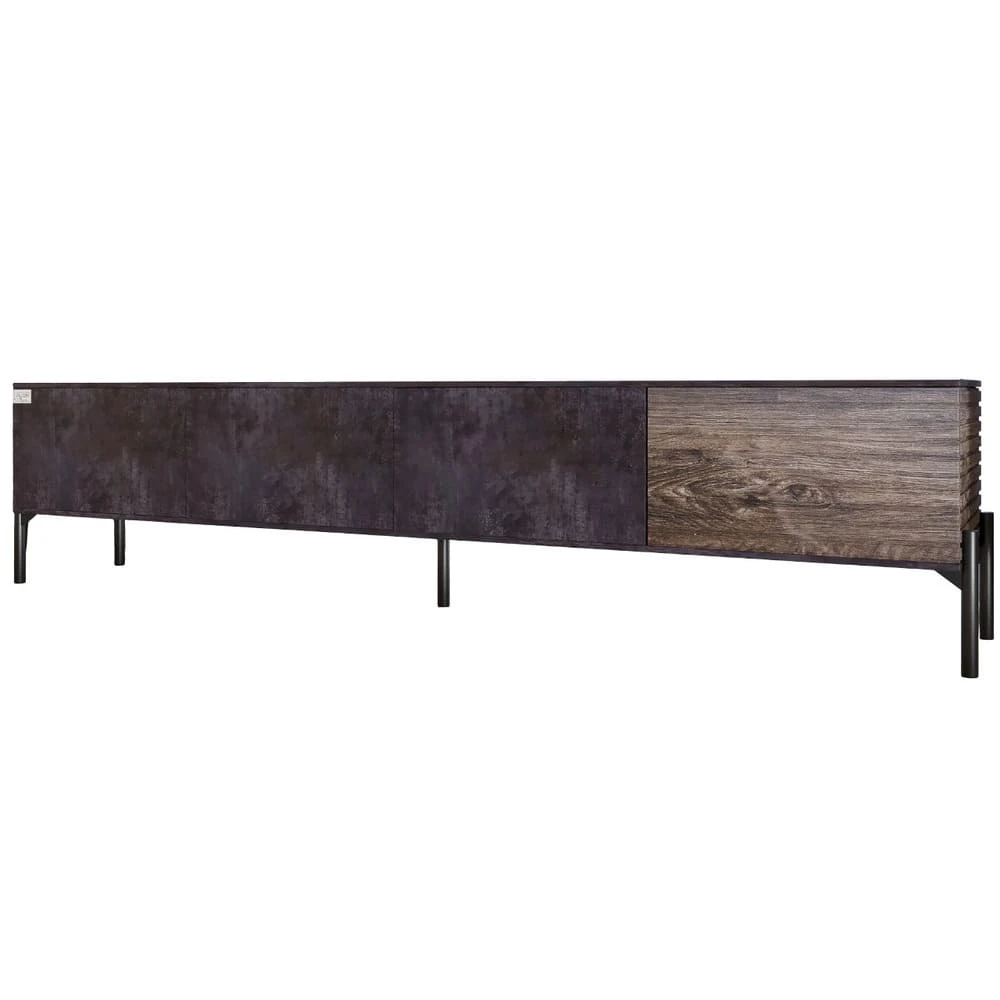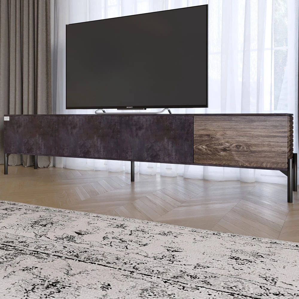Откройте для себя уникальную тумбу под телевизор LION, которая станет не только практичным элементом вашего пространства, но и стильным акцентом в любом интерьере. Ее современный дизайн в сочетании с темным бетоном и деревом создает впечатление элегантности и простоты, подходящей для любой комнаты. Благодаря прочным черным металлическим ножкам, тумба обеспечивает надежную поддержку и устойчивость. Она не только выдерживает вес телевизора, но и предоставляет возможность организовать пространство вокруг него. Внутренние полки предлагают достаточно места для хранения медиаустройств, книг или декоративных элементов, что делает эту тумбу идеальным решением для вашего дома. Она станет центром внимания во время просмотра любимых фильмов или сериалов, придавая вашему интерьеру современный вид и элегантность. Выбирая тумбу LION, вы получаете не только красивый, но и практичный элемент мебели, который прослужит вам долгие годы. Не упустите возможность обновить свой интерьер – приобретите эту стильную тумбу уже сегодня!