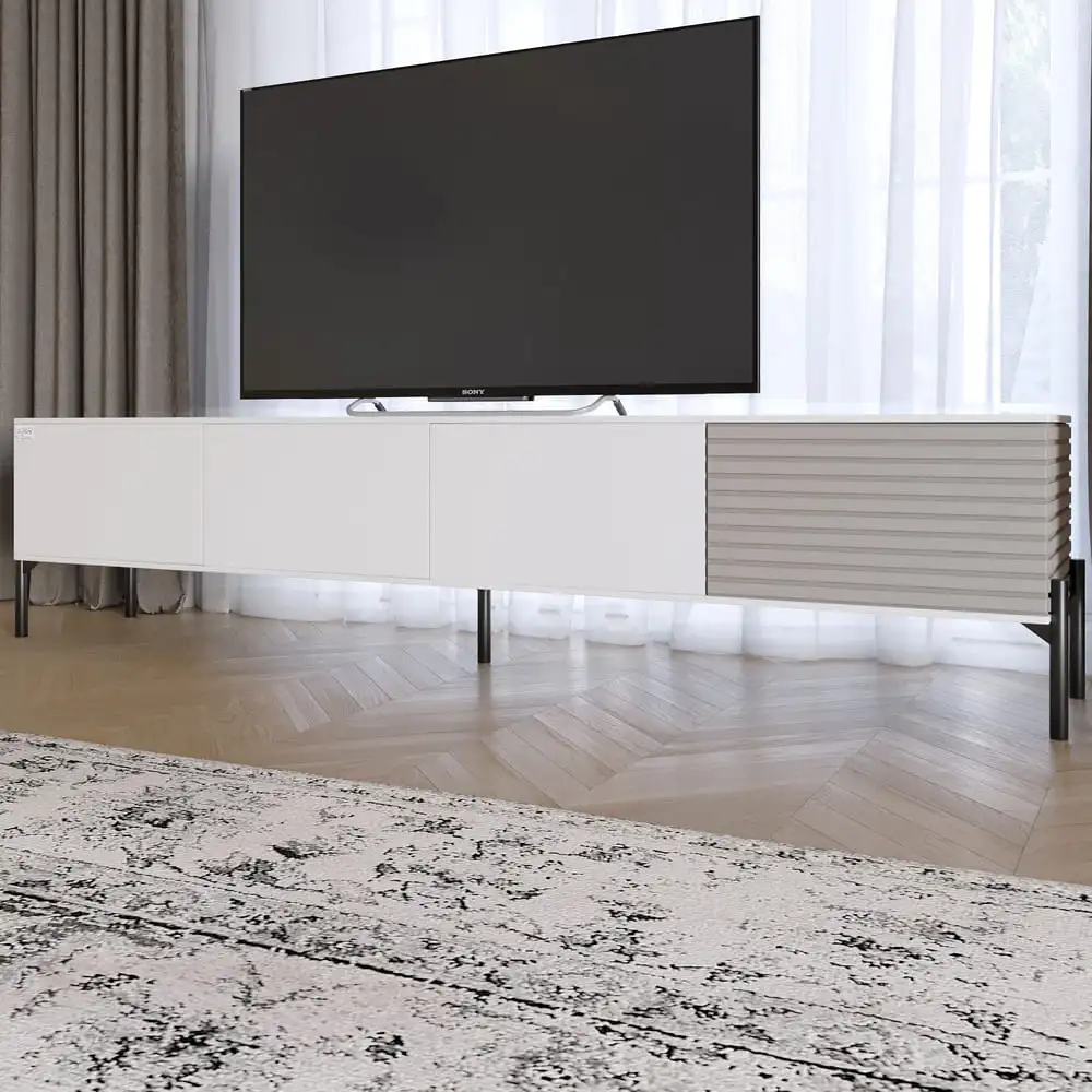 Эта тумба не только поражает своим внешним видом, но и обеспечивает надежность и долговечность. Черные металлические ножки придают стабильности, а также придают современный акцент. Вы сможете без проблем разместить на тумбе телевизор, а также хранить все необходимые аксессуары благодаря продуманному дизайну с достаточным количеством полок и отделений.
