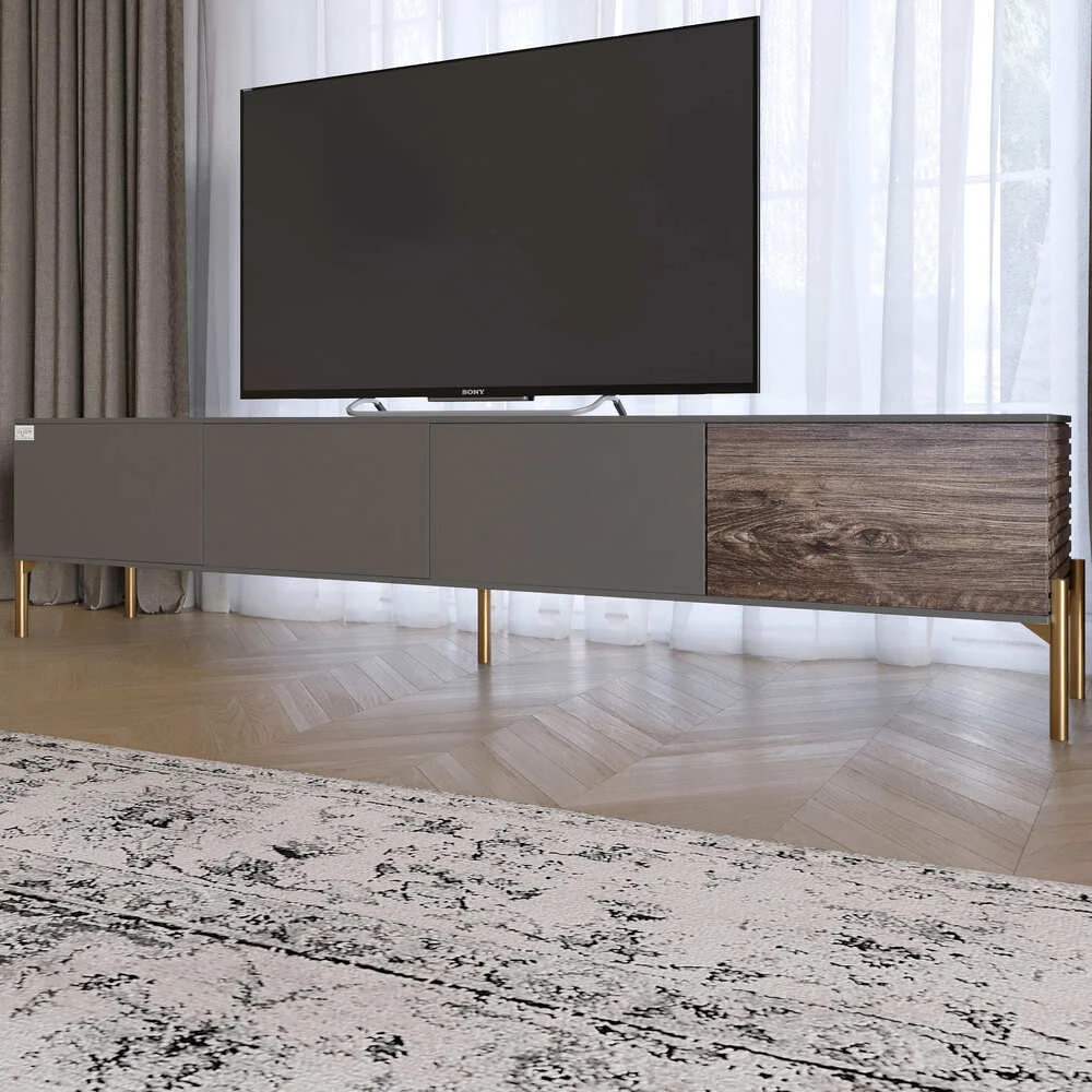 Ваша гостиная заслуживает лучшего, и тумба под телевизор LION станет ярким акцентом в вашем интерьере. Благодаря элегантному дизайну в антрацитовом цвете, она придает современный вид, подчеркивая ваш вкус и стиль. Золотые металлические ножки не только придают стойкости, но и создают роскошный привлекающий внимание контраст.