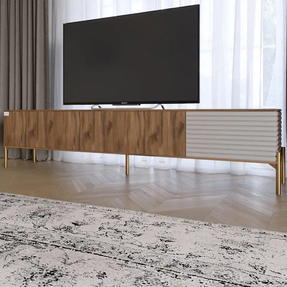 Откройте для себя новый уровень элегантности с тумбой под телевизор LION, которая сочетает в себе современный дизайн и практичность. Ее изысканный цвет Грей Дуб Ливорно в гармонии с кашемировыми оттенками придает интерьеру особый шарм. Благодаря золотым металлическим ножкам, тумба выглядит стильно и современно, подчеркивая вашу индивидуальность.