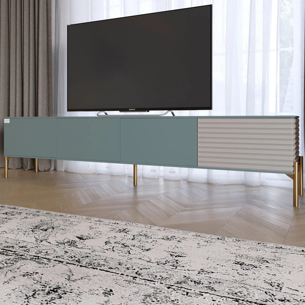 Благодаря золотым металлическим ножкам, эта тумба не только выглядит стильно, но и обеспечивает надежную поддержку для вашего телевизора и аксессуаров. Она станет отличным основанием для вашего телевизора, а также позволит организовать пространство, разместив все необходимые вещи под рукой. Ваша гостиная получит новый вид, а вы – комфорт и удобство.